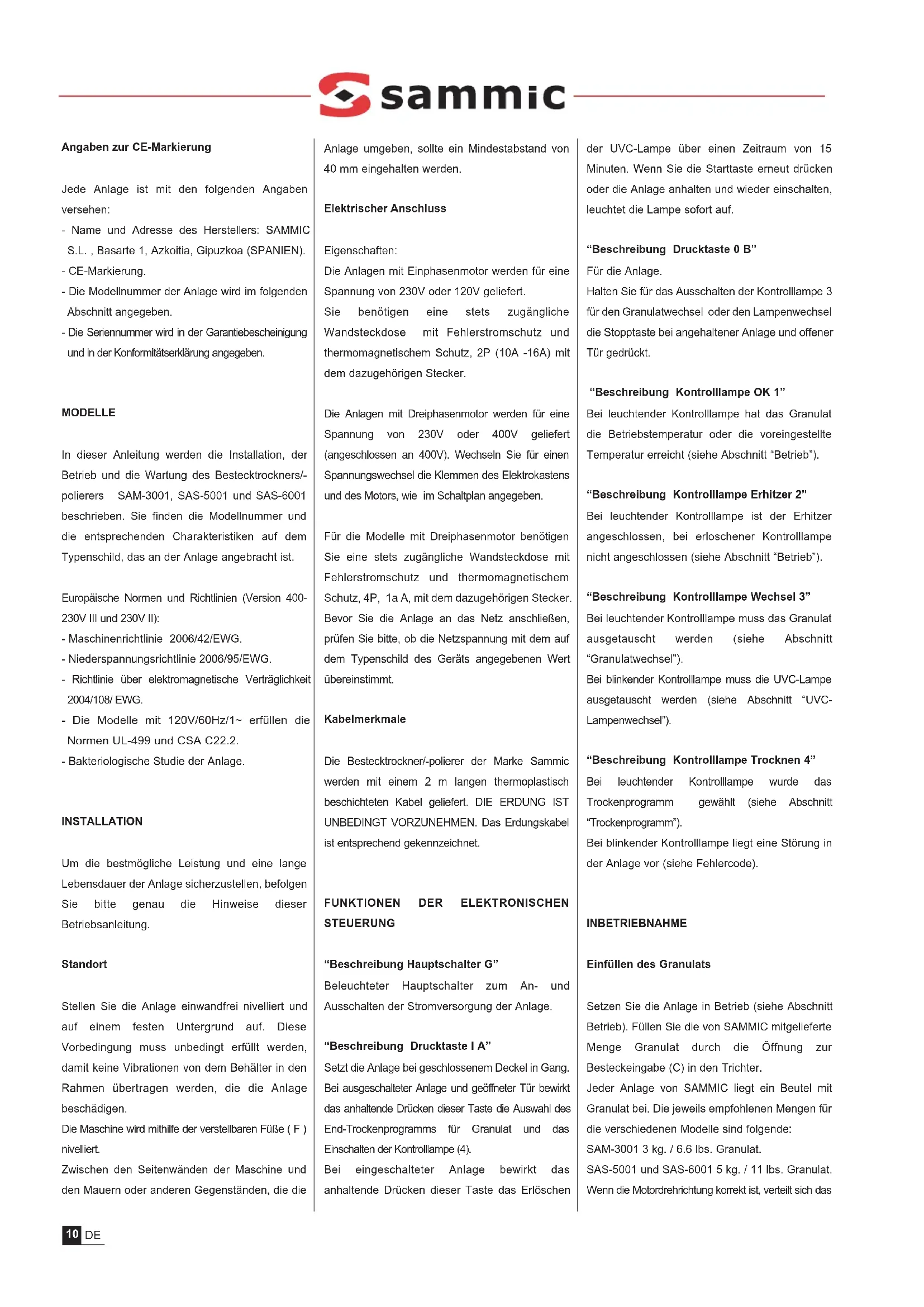 DEGranulat gleichmäßig und in aufsteigender Richtung im Trichter. Schalten Sie die Anlage aus, sobald das Granulat gleichmäßig verteilt ist. Falls dies bei den Dreiphasenanlagen nicht geschieht, wechseln Sie die Drehrichtung des Motors, indem Sie zwei Phasen an der Wandsteckdose untereinander wechseln. Start und Stopp Betätigen Sie den Hauptschalter (G). Drücken Sie die Starttaste (A) bei geschlossenem Deckel: - Beim Anlaufen des Motors beginnt die aufsteigende Bewegung im Behälter, die die Besteckteile spiralförmig bewegt. - Die UVC-Lampe leuchtet auf. - Die Temperatursteuerung schaltet sich ein, damit das Granulat die für das Trocknen und Polieren der Besteckteile notwendige Temperatur erreicht. - Bei den Modellen SAM-3001 und SAS-6001 schaltet sich zusammen mit dem Motor auch ein Ventilator ein, der verhindert, dass der Staub und das Granulat mit den Besteckteilen ausgegeben werden. - Durch das Drücken der Stopptaste (B) oder das Öffnen des oberen Deckels wird die Anlage angehalten. Bei dem Modell SAS-6001 wirkt die Motorenbremse. - Schalten Sie die Stromversorgung über den Hauptschalter (G) ab. Temperatursteuerung und Bestecktrocknung - Bei kaltem Granulat werden die Erhitzer angeschlossen und die Kontrolllampe 2 leuchtet auf. Erhitzer und Kontrolllampe 2 schalten sich aus, sobald die eingestellte Temperatur erreicht wird. Die Kontrolllampe 1 die anzeigt, dass die Anlage bereit ist, leuchtet auf und es ertönt ein durchgehendes akustisches Signal, das darauf hinweist, dass die Besteckteile in die Besteckeingabeöffnung (C) eingeführt werden können. Die trockenen Besteckteile werden aus der vorderen Ausgabeöffnung (D) ausgegeben. - Die Besteckteile müssen unbedingt vorher mit heißem Wasser abgespült oder direkt aus dem Geschirrspüler kommend eingegeben werden, d.h. sie müssen immer feucht sein. - Das Granulat kühlt ab, der Erhitzer wird ab einem bestimmten Punkt angeschlossen und die Kontrolllampe 2 leuchtet auf. Die Kontrolllampen für Anlagenbereitschaft 1 und Erhitzer 2 leuchten auf. Solange die Kontrolllampe für Anlagenbereitschaft 1 leuchtet, können Sie weiter Besteck einführen. - Wenn die Temperatur des Granulats aufgrund einer übermäßigen Produktion, die Verwendung von kaltem Wasser, usw. weiter sinkt, erlischt die Kontrolllampe für Anlagenbereitschaft und es ertönt ein intermittierendes akustisches Signal. Dies zeigt bedeutet, dass das Granulat erhitzt werden muss. Führen Sie keine weiteren Besteckteile ein und warten Sie, bis die Kontrolllampe 1 erneut aufleuchtet und das durchgehende akustische Signal ertönt. End-Trockenprogramm für Granulat Wählen Sie das Trockenprogramm, indem Sie bei geöffnetem Deckel die Starttaste (A) gedrückt halten, wobei Kontrolllampe 4 aufleuchtet. Schließen Sie den Deckel und starten Sie durch erneutes Drücken der Starttaste (A) das Programm. Die Anlage startet und das Granulat heizt sich auf die eingestellte Temperatur auf. Die Anlage wartet einige Minuten in eingeschaltetem Zustand und hält automatisch bei Beendigung des Programms an. Starten Sie dieses Programm, wenn das Granulat feucht ist oder die Anlage intensiv genutzt wurde. Starten Sie dieses Programm nicht bei trockenem Granulat. Sie können das Programm anhalten, indem Sie die Stopptaste (B) drücken oder die Tür öffnen. Granulatwechsel Durch die Verwendung, das Erhitzen und die Feuchtigkeit verschlechtert sich die Qualität des Granulats. Das Aufleuchten der Kontrolllampe 3 zeigt an, dass das Granulat ausgetauscht werden muss. Die Kontrolllampe leuchtet nach 200 Stunden auf. Saugen Sie für den Granulatwechsel zunächst das Granulat ab. Befüllen Sie den Trichter mit der von Sammic gelieferten Granulatmenge über die mittlere Besteckeingabeöffnung (C). Halten Sie zum Zurücksetzen der Meldung die Stopptaste (B) bei angehaltener Anlage und geöffneter Tür gedrückt. UVC-Lampenwechsel Im Laufe ihrer Einsatzzeit lässt die Wirksamkeit der UVC-Lampe nach. Das Blinken der Kontrolllampe 3 zeigt an, dass die UVC-Lampe ausgetauscht werden muss. Die Kontrolllampe blinkt nach 1000 Stunden. Halten Sie zum Zurücksetzen der Meldung die Stopptaste (B) bei angehaltener Anlage und geöffneter Tür gedrückt. Temperatureinstellung Wählen Sie die Temperatur aus, indem Sie in der Elektronikplatte das einzige Potentiometer drehen. Der Temperaturbereich ist auf die Elektronikplatte aufgedruckt. Arbeitsleistung Die im Folgenden genannten Produktionsmengen richten sich nach dem Gewicht der Besteckteile und nach dem Einfülltakt. SAM-3001: zwischen 2000 und 2500 Besteckteile / Stunde SAS-5001: zwischen 3500 und 5000 Besteckteile / Stunde SAS-6001: zwischen 3500 und 5000 Besteckteile / Stunde Die Besteckteile werden nach und nach eingegeben, solange die vorherigen noch mit Granulat bedeckt sind (zwischen 5 und 10 Besteckteile pro Eingabevorgang). Beschickungsgeschwindigkeit SAM-3001 6 Stk. / alle 10 Sekunden. SAS-5001 14 Stk. / alle 10 Sekunden. SAS-6001 14 Stk. / alle 10 Sekunden. Achten Sie darauf, dass die Besteckteile gleichmäßig und kontinuierlich aus der Besteckabgabeöffnung (B) austreten. Entkeimung Die Bestecktrockner/-polierer der Marke SAMMIC sind mit einer Lampe bestückt, die UVC-Strahlen für die Entkeimung der Besteckteile und des Granulats abgibt. Diese Lampe wurde getestet und ist zugelassen, und die Besteckteile verlassen die Anlage in einwandfrei entkeimtem Zustand. Die Strahlen dieser Lampe sind schädlich für Augen und Haut. Von Seiten SAMMIC sind alle erforderlichen