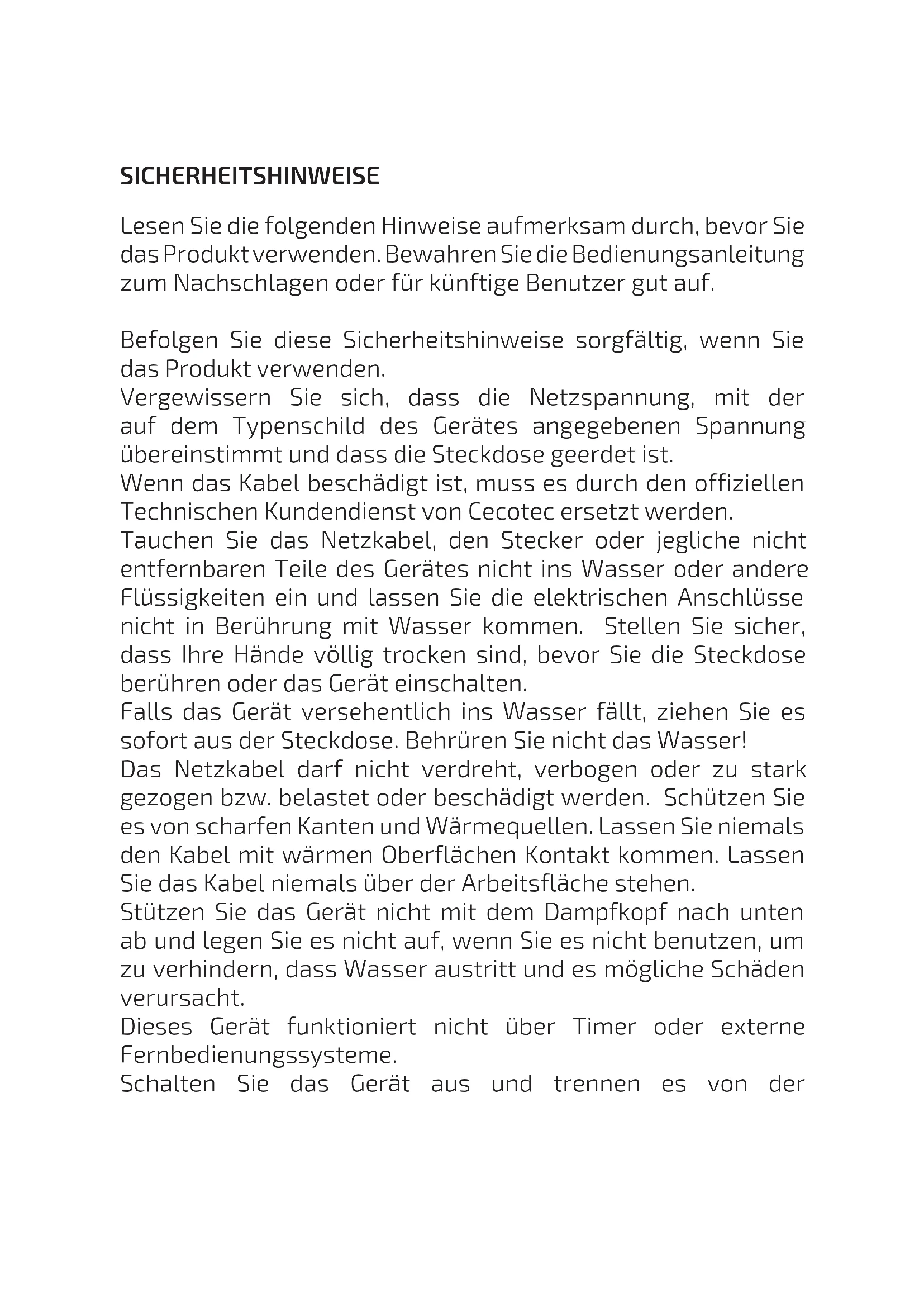Nehmen Sie das Gerät aus der Verpackung. Vergewissern Sie sich, dass das Produkt alle die Zubehöre beinhaltet und dass keine sichtbare Schäden hat. Falls Sie Schäden gesehen hat, kontaktieren Sie den Kundendienst von Cecotec. Entfernen Sie jegliches Verpackungsmaterial, Aufkleber oder Schutzvorrichtungen, die sich am Hauptkörper oder am Kabel befinden. Um die Gefahr von Verbrennungen oder Schäden zu vermeiden, überprüfen Sie das Gerät ordnungsgemäß, indem Sie die Dampftaste fern von Personen drücken. Hinweis: Destilliertem, gereinigtem oder gefiltertem Wasser wird empfohlen für eine optimale Leistung. Leitungswasser enthält Mineralien, die sich mit der Zeit ansammeln könnte.