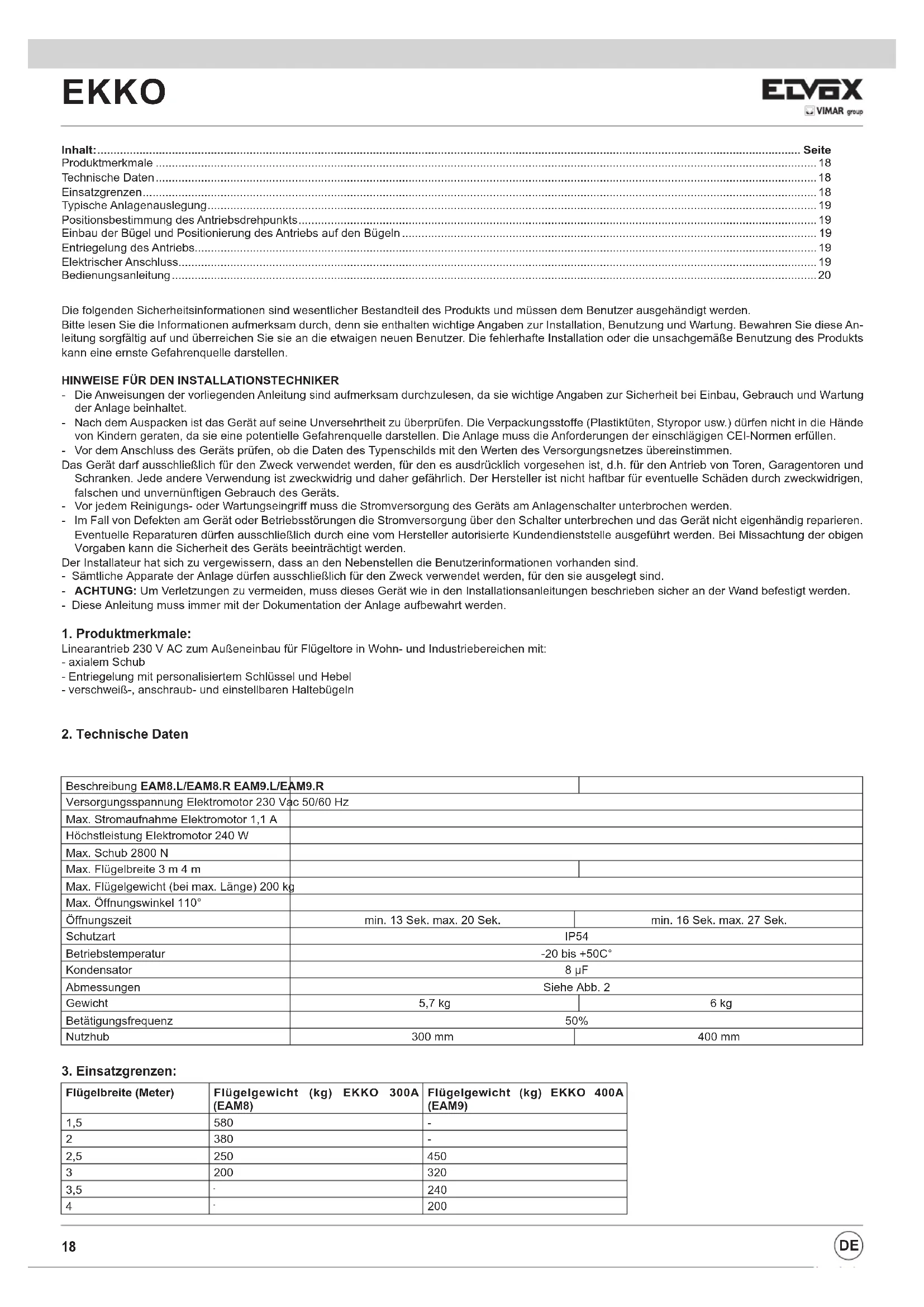 Beschreibung EAM8.L/EAM8.R EAM9.L/EAM9.R Versorgungsspannung Elektromotor 230 Vac 50/60 Hz Max. Stromaufnahme Elektromotor 1,1 A Höchstleistung Elektromotor 240 W Max. Schub 2800 N Max. Flügelbreite 3 m 4 m Max. Flügelgewicht (bei max. Länge) 200 kg Max. Öffnungswinkel 110° Öffnungszeit min. 13 Sek. max. 20 Sek. min. 16 Sek. max. 27 Sek. Schutzart IP54 Betriebstemperatur -20 bis +50C° Kondensator 8 μF Abmessungen Siehe Abb. 2 Gewicht 5,7 kg 6 kg Betätigungsfrequenz 50% Nutzhub 300 mm 400 mm Flügelbreite (Meter) Flügelgewicht (kg) EKKO 300A (EAM8) Flügelgewicht (kg) EKKO 400A (EAM9) 1,5 580 - 2 380 - 2,5 250 450