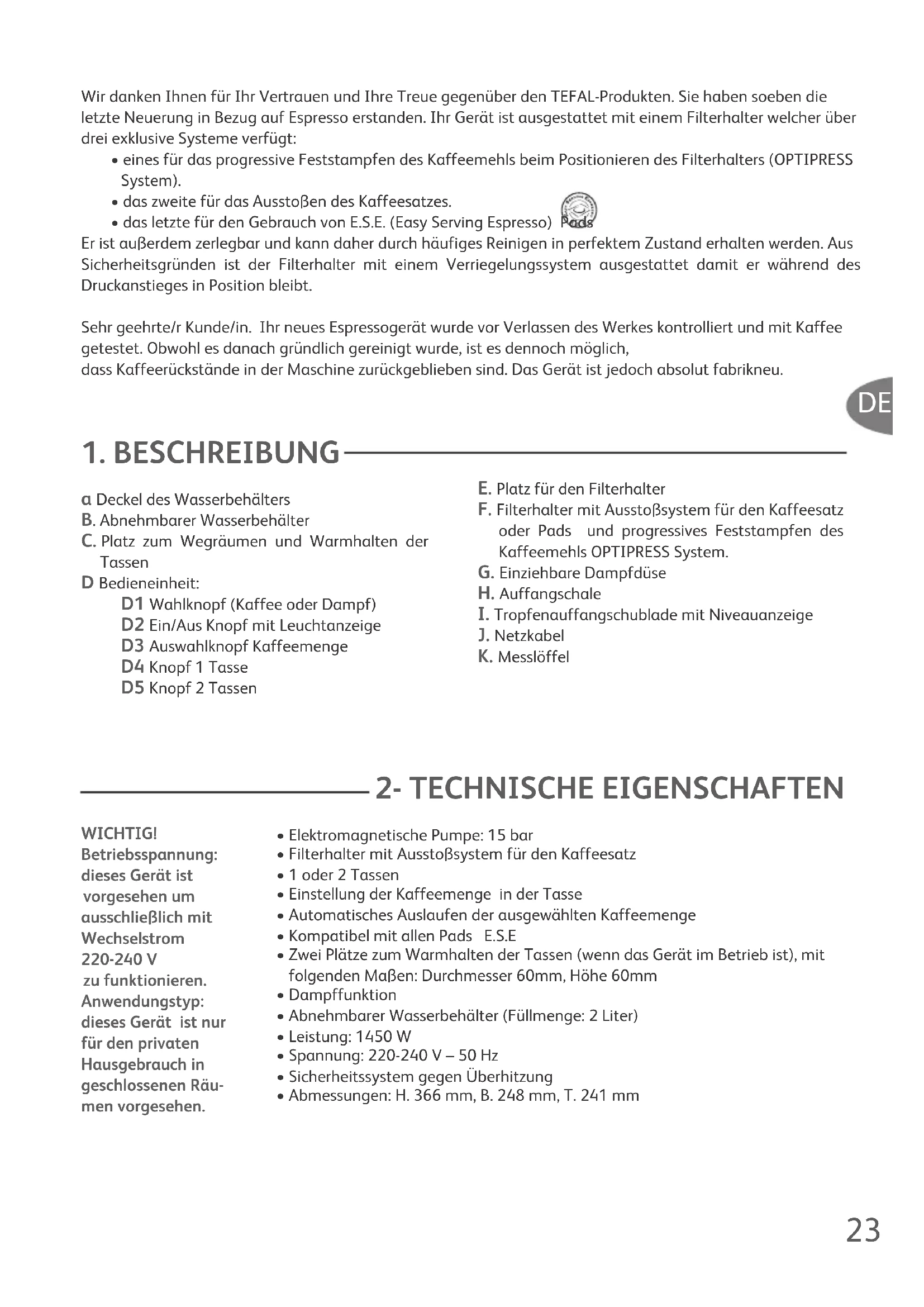 - Abmessungen: H. 366 mm, B. 248 mm, T. 241 mm WICHTIG! Betriebsspannung: dieses Gerät ist vorgesehen um ausschließlich mit Wechselstrom 220-240 V zu funktionieren. Anwendungstyp: dieses Gerät ist nur für den privaten Hausgebrauch in geschlossenen Räu- men vorgesehen. 7267 - TEFAL espremio 6400 - 0827971:Mise en page 1 18/03/08 13:53 Page 2324