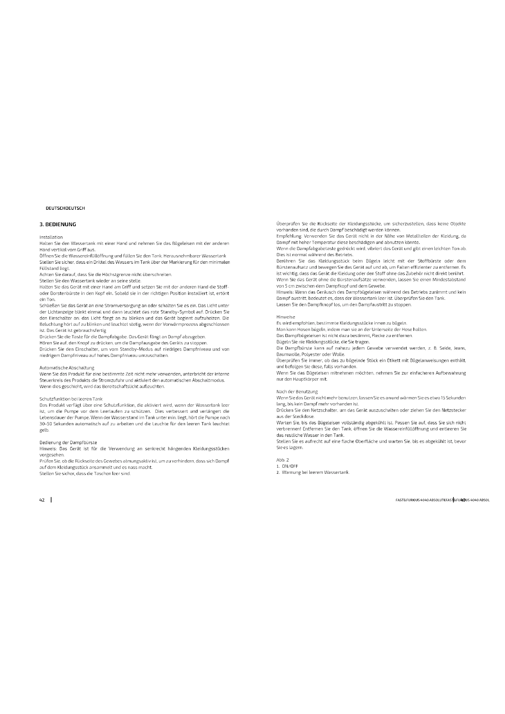 Nehmen Sie das Gerät aus der Verpackung. Vergewissern Sie sich, dass das Produkt alle die Zubehöre beinhaltet und dass keine sichtbare Schäden hat. Falls Sie Schäden gesehen hat, kontaktieren Sie den Kundendienst von Cecotec. Entfernen Sie Reste von Klebebändern oder Schutzelementen auf der Dampfauslass. Auswickeln und ziehen Sie das Kabel. Bauen Sie das Zubehör gemäß dieser Anleitung zusammen, füllen Sie den Wassertank und verwenden Sie das Bügeleisen mit einem alten Kleidungsstück, um mögliche Rückstände zu entfernen. Es ist möglich, dass das Gerät bei dem ersten Gebrauch einige Wassertropfe erzeugt. Das ist ganz normal. Hinweis: Wenn Sie das Dampfbügeleisen erstmals in Betrieb nehmen, lassen Sie den Dampf während einige Minuten herauslassen, um Verunreinigungen zu und schlechte Gerüche von der Herstellung entfernen.FAST&FURIOUS 4040 ABSOLUTEFAST&FURIOUS 4040 ABSOLUTE