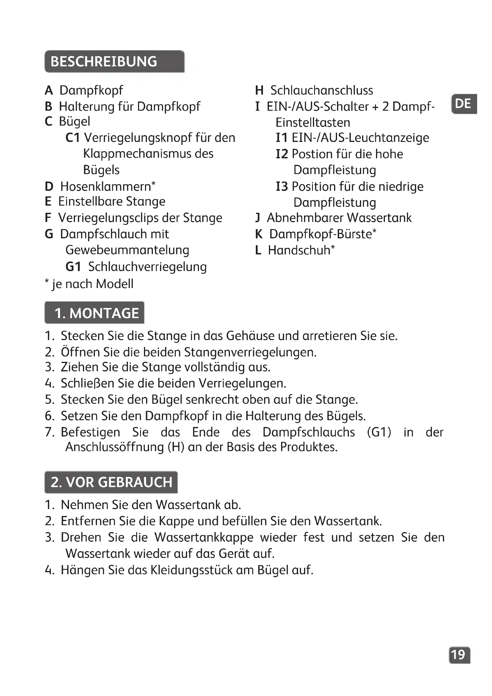 BESCHREIBUNG A Dampfkopf B Halterung für Dampfkopf C Bügel C1 Verriegelungsknopf für den Klappmechanismus des Bügels D Hosenklammern* E Einstellbare Stange F Verriegelungsclips der Stange G Dampfschlauch mit Gewebeummantelung G1 Schlauchverriegelung H Schlauchanschluss I EIN-/AUS-Schalter + 2 Dampf- Einstelltasten I1 EIN-/AUS-Leuchtanzeige I2 Postion für die hohe Dampfleistung I3 Position für die niedrige Dampfleistung J Abnehmbarer Wassertank K Dampfkopf-Bürste* L Handschuh*