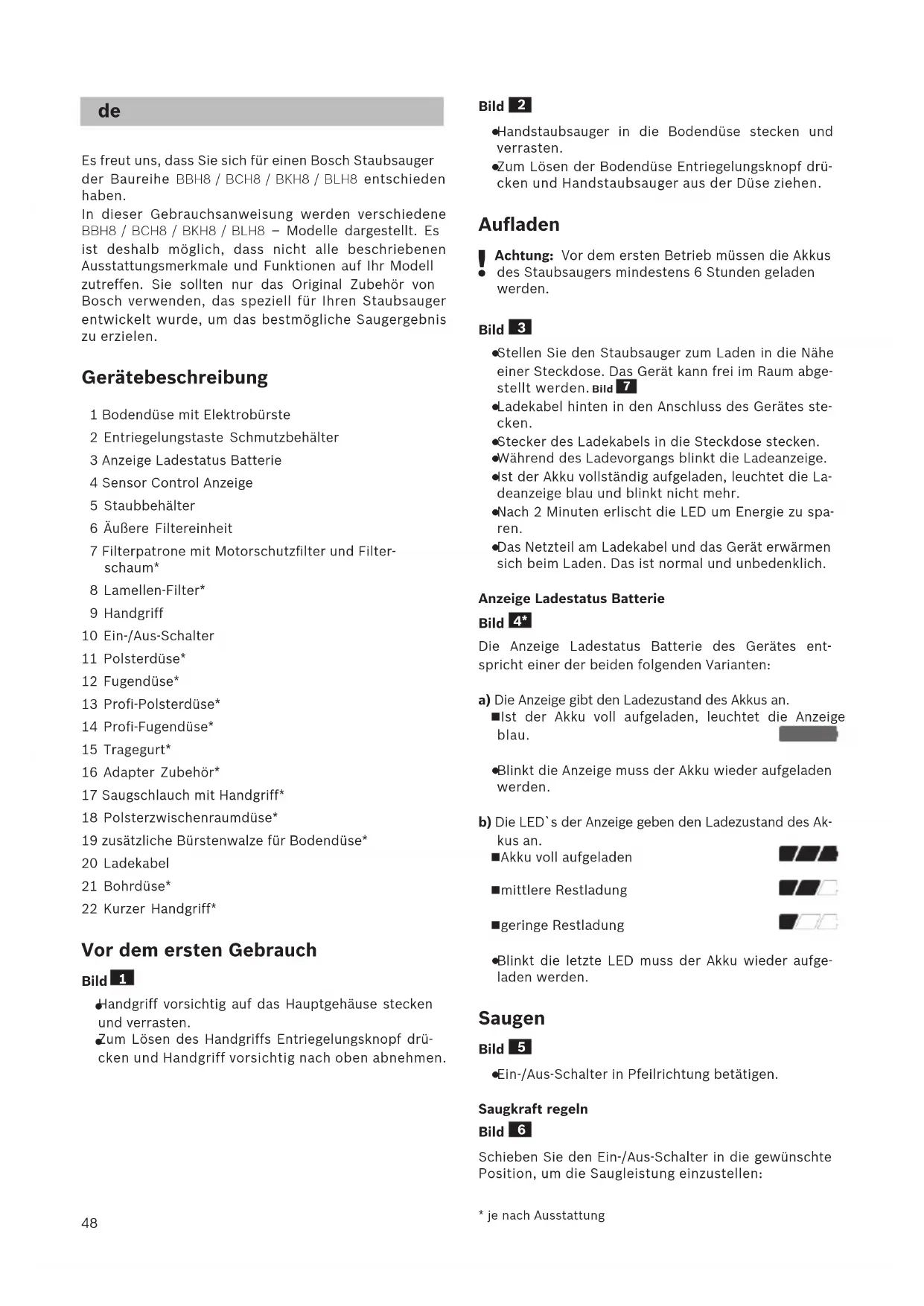 Es freut uns, dass Sie sich für einen Bosch Staubsauger der Baureihe BBH8 / BCH8 / BKH8 / BLH8 entschieden haben. In dieser Gebrauchsanweisung werden verschiedene BBH8 / BCH8 / BKH8 / BLH8 – Modelle dargestellt. Es ist deshalb möglich, dass nicht alle beschriebenen Ausstattungsmerkmale und Funktionen auf Ihr Modell zutreffen. Sie sollten nur das Original Zubehör von Bosch verwenden, das speziell für Ihren Staubsauger entwickelt wurde, um das bestmögliche Saugergebnis zu erzielen. Gerätebeschreibung 1 Bodendüse mit Elektrobürste 2 Entriegelungstaste Schmutzbehälter 3 Anzeige Ladestatus Batterie 4 Sensor Control Anzeige 5 Staubbehälter 6 Äußere Filtereinheit 7 Filterpatrone mit Motorschutzfilter und Filter- schaum* 8 Lamellen-Filter* 9 Handgriff 10 Ein-/Aus-Schalter 11 Polsterdüse* 12 Fugendüse* 13 Profi-Polsterdüse* 14 Profi-Fugendüse* 15 Tragegurt* 16 Adapter Zubehör* 17 Saugschlauch mit Handgriff* 18 Polsterzwischenraumdüse* 19 zusätzliche Bürstenwalze für Bodendüse* 20 Ladekabel 21 Bohrdüse* 22 Kurzer Handgriff* Vor dem ersten Gebrauch Bild