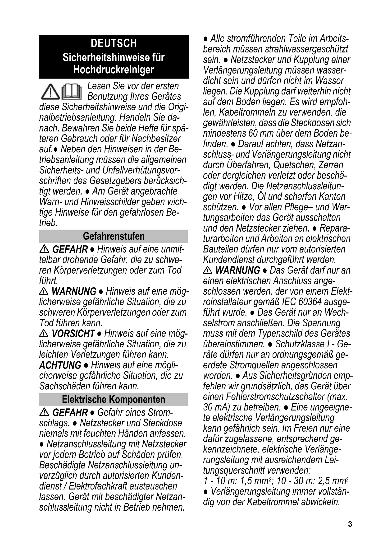 ● Verlängerungsleitung immer vollstän- dig von der Kabeltrommel abwickeln. DEUTSCH Sicherheitshinweise für Hochdruckreiniger Gefahrenstufen Elektrische Komponenten4