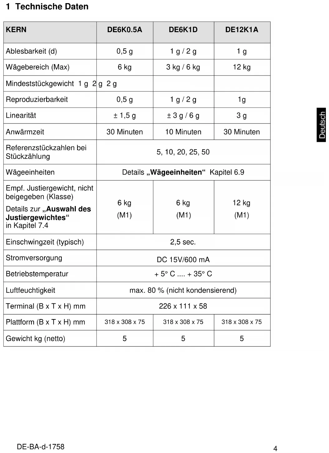 1 Technische Daten KERN DE6K0.5A DE6K1D DE12K1A Ablesbarkeit (d) 0,5 g 1 g / 2 g 1 g Wägebereich (Max) 6 kg 3 kg / 6 kg 12 kg Mindeststückgewicht 1 g 2 g 2 g Reproduzierbarkeit 0,5 g 1 g / 2 g 1g Linearität ± 1,5 g ± 3 g / 6 g 3 g Anwärmzeit 30 Minuten 10 Minuten 30 Minuten Referenzstückzahlen bei Stückzählung 5, 10, 20, 25, 50 Wägeeinheiten Details „Wägeeinheiten“ Kapitel 6.9 Empf. Justiergewicht, nicht beigegeben (Klasse) Details zur „Auswahl des Justiergewichtes“ in Kapitel 7.4 6 kg (M1) 6 kg (M1) 12 kg (M1) Einschwingzeit (typisch) 2,5 sec. Stromversorgung DC 15V/600 mA Betriebstemperatur + 5° C .... + 35° C Luftfeuchtigkeit max. 80 % (nicht kondensierend) Terminal (B x T x H) mm 226 x 111 x 58 Plattform (B x T x H) mm 318 x 308 x 75 318 x 308 x 75 318 x 308 x 75 Gewicht kg (netto) 5 5 55 DE-BA-d-1758 KERN DE15K0.2D DE15K2D DE24K2A Ablesbarkeit (d) 0,2 g / 0,5 g 2 g / 5 g 2 g Wägebereich (Max) 6 kg / 15 kg 6 kg / 15 kg 24 kg Mindeststückgewicht 400 mg 4 g 4 g Reproduzierbarkeit 0,2 g / 0,5 g 2 g / 5g 2 g Linearität ± 0,8 g / 2 g ± 6 g / 15 g ± 6 g Anwärmzeit 2 Stunden 10 Minuten 30 Minuten Referenzstückzahlen bei Stückzählung 5, 10, 20, 25, 50 Wägeeinheiten Details „Wägeeinheiten“ Kapitel 6.9 Empf. Justiergewicht, nicht beigegeben (Klasse) Details zur „Auswahl des Justiergewichtes“ in Kapitel 7.4 15 kg (F2) 15 kg (M1) 20 kg (M1) Einschwingzeit (typisch) 2,5 sec. Stromversorgung DC 15V/600 mA Betriebstemperatur + 5° C .... + 35° C Luftfeuchtigkeit max. 80 % (nicht kondensierend) Terminal (B x T x H) mm 226 x 111 x 58 Plattform (B x T x H) mm 318 x 308 x 85 318 x 308 x 75 Gewicht kg (netto) 7,5 5DE-BA-d-1758