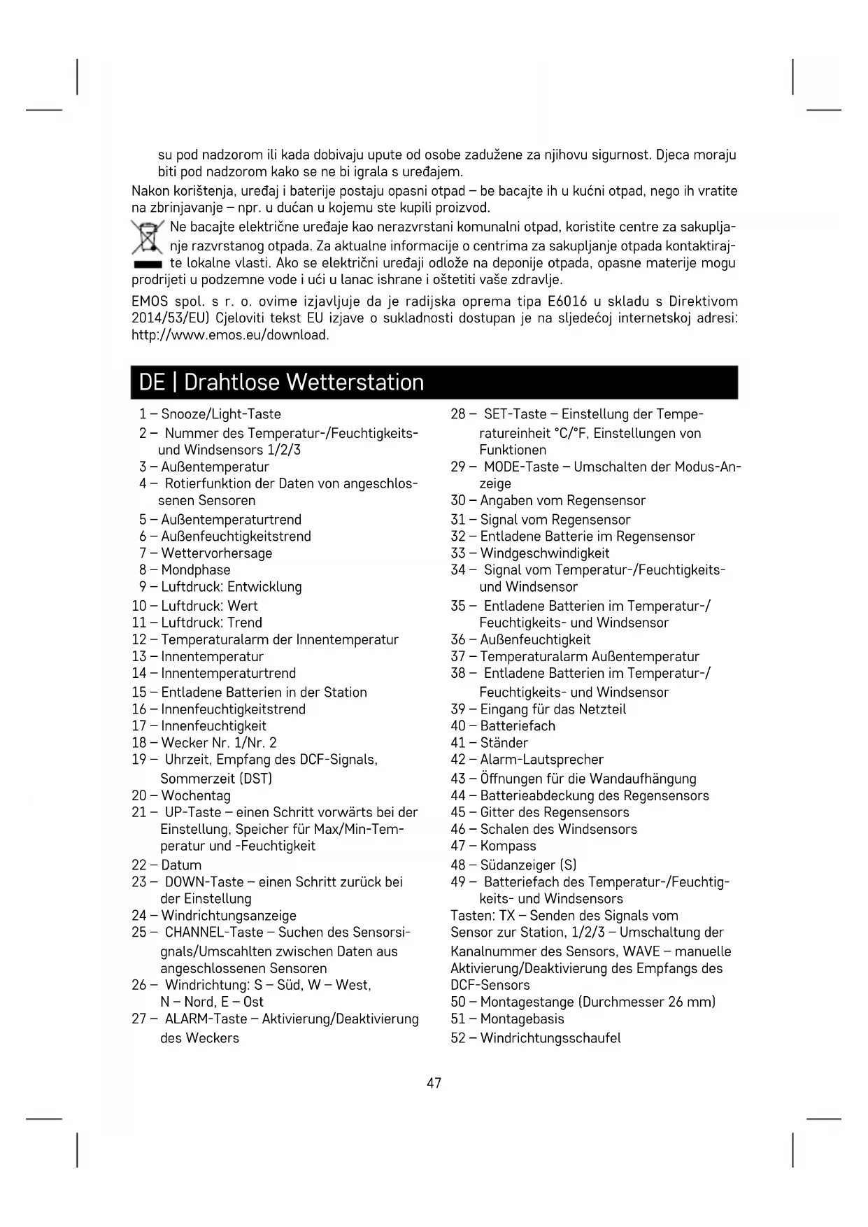 - Nije predviđeno da ovaj uređaj upotrebljavaju osobe (uključujući djecu) smanjenih zičkih, osjetilnih ili mentalnih sposobnosti koje nemaju iskustva i znanja za sigurnu upotrebu uređaja, osim kada47 su pod nadzorom ili kada dobivaju upute od osobe zadužene za njihovu sigurnost. Djeca moraju biti pod nadzorom kako se ne bi igrala s uređajem. Nakon korištenja, uređaj i baterije postaju opasni otpad – be bacajte ih u kućni otpad, nego ih vratite na zbrinjavanje – npr. u dućan u kojemu ste kupili proizvod. Ne bacajte električne uređaje kao nerazvrstani komunalni otpad, koristite centre za sakuplja- nje razvrstanog otpada. Za aktualne informacije o centrima za sakupljanje otpada kontaktiraj- te lokalne vlasti. Ako se električni uređaji odlože na deponije otpada, opasne materije mogu prodrijeti u podzemne vode i ući u lanac ishrane i oštetiti vaše zdravlje. EMOS spol. s r. o. ovime izjavljuje da je radijska oprema tipa E6016 u skladu s Direktivom 2014/53/EU) Cjeloviti tekst EU izjave o sukladnosti dostupan je na sljedećoj internetskoj adresi: http://www.emos.eu/download. DE | Drahtlose Wetterstation 1 – Snooze/Light-Taste 2 – Nummer des Temperatur-/Feuchtigkeits- und Windsensors 1/2/3 3 – Außentemperatur 4 – Rotierfunktion der Daten von angeschlos- senen Sensoren 5 – Außentemperaturtrend 6 – Außenfeuchtigkeitstrend 7 – Wettervorhersage 8 – Mondphase 9 – Luftdruck: Entwicklung 10 – Luftdruck: Wert 11 – Luftdruck: Trend 12 – Temperaturalarm der Innentemperatur 13 – Innentemperatur 14 – Innentemperaturtrend 15 – Entladene Batterien in der Station 16 – Innenfeuchtigkeitstrend 17 – Innenfeuchtigkeit 18 – Wecker Nr. 1/Nr. 2 19 – Uhrzeit, Empfang des DCF-Signals, Sommerzeit (DST) 20 – Wochentag 21 – UP-Taste – einen Schritt vorwärts bei der Einstellung, Speicher für Max/Min-Tem- peratur und -Feuchtigkeit 22 – Datum 23 – DOWN-Taste – einen Schritt zurück bei der Einstellung 24 – Windrichtungsanzeige 25 – CHANNEL-Taste – Suchen des Sensorsi- gnals/Umscahlten zwischen Daten aus angeschlossenen Sensoren 26 – Windrichtung: S – Süd, W – West, N – Nord, E – Ost 27 – ALARM-Taste – Aktivierung/Deaktivierung des Weckers 28 – SET-Taste – Einstellung der Tempe- ratureinheit °C/°F, Einstellungen von Funktionen 29 – MODE-Taste – Umschalten der Modus-An- zeige 30 – Angaben vom Regensensor 31 – Signal vom Regensensor 32 – Entladene Batterie im Regensensor 33 – Windgeschwindigkeit 34 – Signal vom Temperatur-/Feuchtigkeits- und Windsensor 35 – Entladene Batterien im Temperatur-/ Feuchtigkeits- und Windsensor 36 – Außenfeuchtigkeit 37 – Temperaturalarm Außentemperatur 38 – Entladene Batterien im Temperatur-/ Feuchtigkeits- und Windsensor 39 – Eingang für das Netzteil 40 – Batteriefach 41 – Ständer 42 – Alarm-Lautsprecher 43 – Önungen für die Wandaufhängung 44 – Batterieabdeckung des Regensensors 45 – Gitter des Regensensors 46 – Schalen des Windsensors 47 – Kompass 48 – Südanzeiger (S) 49 – Batteriefach des Temperatur-/Feuchtig- keits- und Windsensors Tasten: TX – Senden des Signals vom Sensor zur Station, 1/2/3 – Umschaltung der Kanalnummer des Sensors, WAVE – manuelle Aktivierung/Deaktivierung des Empfangs des DCF-Sensors 50 – Montagestange (Durchmesser 26 mm) 51 – Montagebasis 52 – Windrichtungsschaufel48 Technische Spezikation: Uhr per Funksignal DCF77 gesteuert Zeitformat: 12/24 h Innentemperatur: -10°C bis +50°C, Auösung 0,1°C Außentemperatur: -30°C bis +60°C, Auösung 0,1°C Genauigkeit der Messtemperatur: ±1°C für den Bereich 20°C bis +24°C, ±2°C für den Bereich 0°C bis +20°C und 24°C bis +40°C, ±3°C für den Bereich -20°C bis 0°C und 40°C bis +50°C, ±4°C für sonstige Bereiche. Innen und Außenfeuchtigkeit: 1–99 % relative Feuchtigkeit, Abweichung 1 % Genauigkeit der Luftfeuchtigkeitsmessung: 5 % Anzeige der Messtemperatur: °C/°F Messbereich für atmosphärischen Druck: 800 hPa bis 1 100 hPa Druckeinheit: hPa/inHg Messbereich des Windsensors: 0 bis 127,5 km/h Maßeinheit des Windsensors: km/mph Messbereich des Regensensors: 0 bis 2 999 mm Maßeinheit des Regensensors: mm/inch Reichweite des Funksignals: bis zu 100 m im freien Raum Anzahl der Sensoren, die sich anschließen lassen: max. 3 (Temperatur-/Feuchte-/Windsensor), max. 1 (Regensensor) Funksensor: Übertragungsfrequenz 433 MHz, 10 mW eektive Sendeleistung max. Stromversorgung der Station: 3× 1,5 V AAA (sind nicht im Lieferumfang enthalten) Adapter AC 230 V/DC 5 V, 300 mA (im Lieferumfang enthalten) Stromversorgung des Temperatur-/Feuchtigkeits- und Windsensors: 4× 1,5 V AA (nicht im Liefer- umfang enthalten) Stromversorgung des Regensensors: 2× 1,5 V AA (nicht im Lieferumfang enthalten) Maße und Gewicht der Station: 17 × 192 × 127 mm, 364 g Abmessungen und Gewicht des Temperatur-/Feuchtigkeits- und Windsensors: 275 × 135 × 310 mm, 377 g (ohne Batterien) Abmessungen und Gewicht des Temperatursensors: 100 × 106 × 166 mm, 220 g (ohne Batterien) Inbetriebnahme/Installation