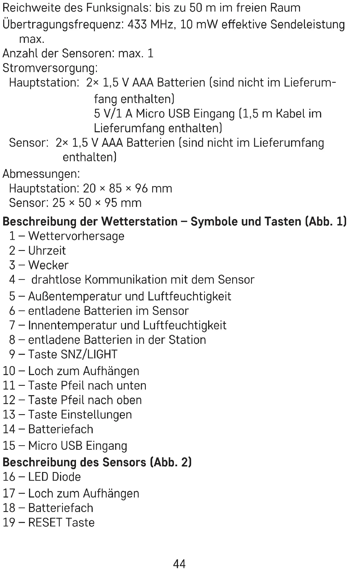 - Nije predviđeno da ovaj uređaj upotrebljavaju osobe (uključujući djecu) smanjenih zičkih, osjetilnih ili mentalnih sposobnosti ili osobe koje nemaju iskustva i znanja za sigurnu upotrebu osim ako nisu pod nadzorom ili ako ne dobivaju upute od osobe zadužene za njihovu sigurnost. Ne bacajte električne uređaje kao nerazvrstani komunalni otpad, koristite centre za sakupljanje razvrstanog otpada. Za aktualne informacije o centrima za sakupljanje otpada kon- taktirajte lokalne vlasti. Ako se električni uređaji odlože na deponije otpada, opasne materije mogu prodrijeti u podzemne vode i ući u lanac ishrane i oštetiti vaše zdravlje. EMOS spol. s r. o. ovime izjavljuje da je radijska oprema tipa E8647 u skladu s Direktivom 2014/53/EU. Cjeloviti tekst EU izjave o sukladnosti dostupan je na sljedećoj internetskoj adresi: http://www.emos.eu/download. DE | Drahtlose Wetterstation Bevor Sie mit dem Produkt zu arbeiten beginnen, lesen Sie bitte aufmerksam diese Bedienungsanleitung durch. Spezikationen Quarzgesteuerte Uhr Zeitformat: 12/24 h Innentemperatur: -10°C bis +50°C, Auösung 0,1°C Außentemperatur: -50°C bis +70°C, Auösung 0,1°C Genauigkeit der Temperaturmessung: ±1°C für den Bereich 0°C bis +50°C, ±2°C für den Bereich -20°C bis 0°C, ±4°C für den Bereich -40°C bis -20°C, mehr als ±4°C für sonstige Bereiche Innen und Außenfeuchtigkeit: 20% bis 95% relative Luftfeuchtig- keit RV, Auösung 1% Genauigkeit der Luftfeuchtigkeitsmessung: ±5% für den Bereich 30% bis 50% RV, ±10% für den Bereich 20% bis 29% RV und 51% bis 95% RV44 Reichweite des Funksignals: bis zu 50 m im freien Raum Übertragungsfrequenz: 433 MHz, 10 mW eektive Sendeleistung max. Anzahl der Sensoren: max. 1 Stromversorgung: Hauptstation: 2× 1,5 V AAA Batterien (sind nicht im Lieferum- fang enthalten) 5 V/1 A Micro USB Eingang (1,5 m Kabel im Lieferumfang enthalten) Sensor: 2× 1,5 V AAA Batterien (sind nicht im Lieferumfang enthalten) Abmessungen: Hauptstation: 20 × 85 × 96 mm Sensor: 25 × 50 × 95 mm Beschreibung der Wetterstation – Symbole und Tasten (Abb. 1) 1 – Wettervorhersage 2 – Uhrzeit 3 – Wecker 4 – drahtlose Kommunikation mit dem Sensor 5 – Außentemperatur und Luftfeuchtigkeit 6 – entladene Batterien im Sensor 7 – Innentemperatur und Luftfeuchtigkeit 8 – entladene Batterien in der Station 9 – Taste SNZ/LIGHT 10 – Loch zum Aufhängen 11 – Taste Pfeil nach unten 12 – Taste Pfeil nach oben 13 – Taste Einstellungen 14 – Batteriefach 15 – Micro USB Eingang Beschreibung des Sensors (Abb. 2) 16 – LED Diode 17 – Loch zum Aufhängen 18 – Batteriefach 19 – RESET Taste45 Hinweis Verwenden Sie nur Alkaline-Batterien 1,5V des gleichen Typs, ver- wenden Sie keine wiederauadbaren 1,2V Batterien. Eine niedrigere Spannung kann eine Funktionsstörung beider Ein- heiten verursachen. Inbetriebnahme