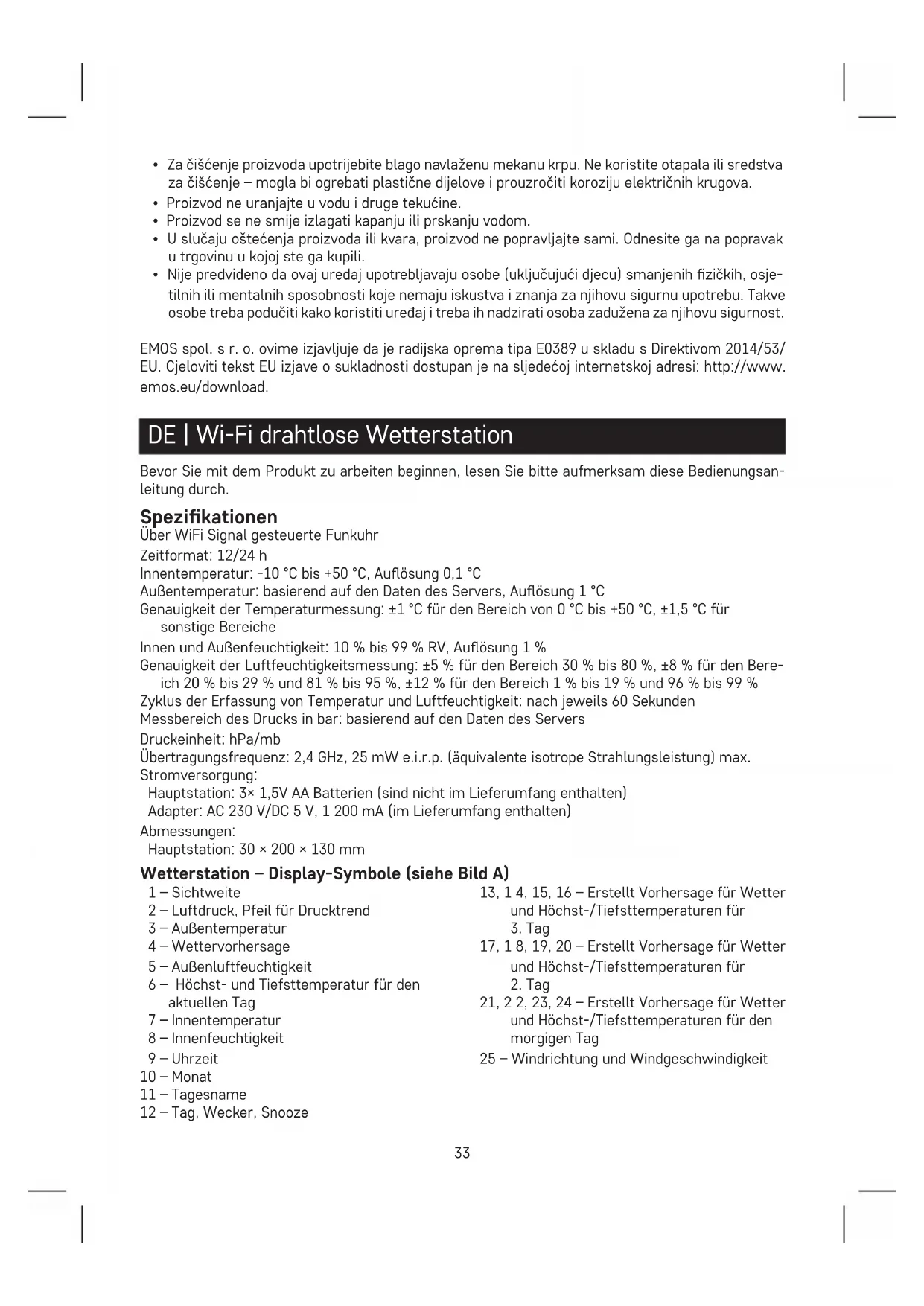 - Nije predviđeno da ovaj uređaj upotrebljavaju osobe (uključujući djecu) smanjenih zičkih, osje- tilnih ili mentalnih sposobnosti koje nemaju iskustva i znanja za njihovu sigurnu upotrebu. Takve osobe treba podučiti kako koristiti uređaj i treba ih nadzirati osoba zadužena za njihovu sigurnost. EMOS spol. s r. o. ovime izjavljuje da je radijska oprema tipa E0389 u skladu s Direktivom 2014/53/ EU. Cjeloviti tekst EU izjave o sukladnosti dostupan je na sljedećoj internetskoj adresi: http://www. emos.eu/download. DE | Wi-Fi drahtlose Wetterstation Bevor Sie mit dem Produkt zu arbeiten beginnen, lesen Sie bitte aufmerksam diese Bedienungsan- leitung durch. Spezikationen Über WiFi Signal gesteuerte Funkuhr Zeitformat: 12/24 h Innentemperatur: -10 °C bis +50 °C, Auösung 0,1 °C Außentemperatur: basierend auf den Daten des Servers, Auösung 1 °C Genauigkeit der Temperaturmessung: ±1 °C für den Bereich von 0 °C bis +50 °C, ±1,5 °C für sonstige Bereiche Innen und Außenfeuchtigkeit: 10 % bis 99 % RV, Auösung 1 % Genauigkeit der Luftfeuchtigkeitsmessung: ±5 % für den Bereich 30 % bis 80 %, ±8 % für den Bere- ich 20 % bis 29 % und 81 % bis 95 %, ±12 % für den Bereich 1 % bis 19 % und 96 % bis 99 % Zyklus der Erfassung von Temperatur und Luftfeuchtigkeit: nach jeweils 60 Sekunden Messbereich des Drucks in bar: basierend auf den Daten des Servers Druckeinheit: hPa/mb Übertragungsfrequenz: 2,4 GHz, 25 mW e.i.r.p. (äquivalente isotrope Strahlungsleistung) max. Stromversorgung: Hauptstation: 3× 1,5V AA Batterien (sind nicht im Lieferumfang enthalten) Adapter: AC 230 V/DC 5 V, 1 200 mA (im Lieferumfang enthalten) Abmessungen: Hauptstation: 30 × 200 × 130 mm Wetterstation – Display-Symbole (siehe Bild A) 1 – Sichtweite 2 – Luftdruck, Pfeil für Drucktrend 3 – Außentemperatur 4 – Wettervorhersage 5 – Außenluftfeuchtigkeit 6 – Höchst- und Tiefsttemperatur für den aktuellen Tag 7 – Innentemperatur 8 – Innenfeuchtigkeit 9 – Uhrzeit 10 – Monat 11 – Tagesname 12 – Tag, Wecker, Snooze 13, 1 4, 15, 16 – Erstellt Vorhersage für Wetter und Höchst-/Tiefsttemperaturen für