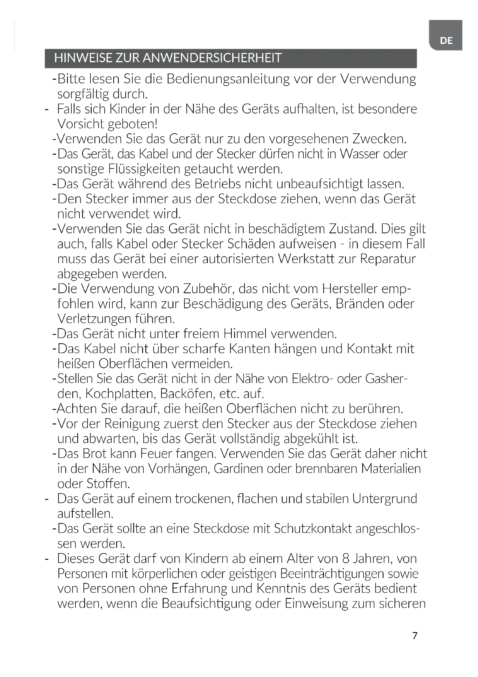 Warnung! Ziehen Sie das feststeckende Brot mit keinem Messer oder einem anderen Gegenstand heraus, da der Kontakt mit stromführenden Teilen einen tödlichen Stromschlag verursa- chen kann. - Wichg! Das Gerät ist nicht zum Betrieb mit externen zeitlich eingestellten Abschaltmechanismen oder einem separaten Fernbedienungssystem geeignet. - Das Gerät und das Kabel an einer für Kinder unter 8 Jahren un