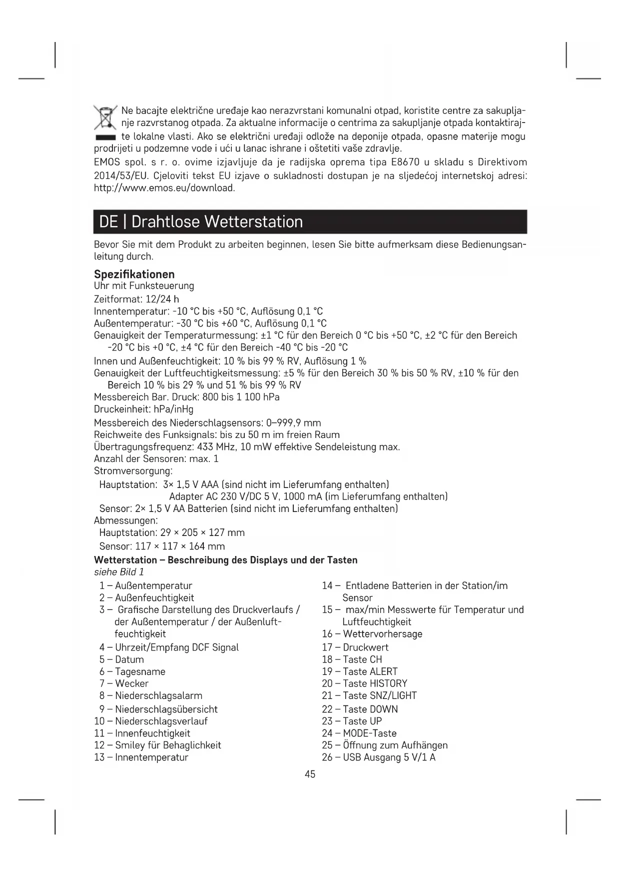 - Nije predviđeno da ovaj uređaj upotrebljavaju osobe (uključujući djecu) smanjenih zičkih, osje- tilnih ili mentalnih sposobnosti koje nemaju iskustva i znanja za njihovu sigurnu upotrebu. Takve osobe treba podučiti kako koristiti uređaj i treba ih nadzirati osoba zadužena za njihovu sigurnost.45 Ne bacajte električne uređaje kao nerazvrstani komunalni otpad, koristite centre za sakuplja- nje razvrstanog otpada. Za aktualne informacije o centrima za sakupljanje otpada kontaktiraj- te lokalne vlasti. Ako se električni uređaji odlože na deponije otpada, opasne materije mogu prodrijeti u podzemne vode i ući u lanac ishrane i oštetiti vaše zdravlje. EMOS spol. s r. o. ovime izjavljuje da je radijska oprema tipa E8670 u skladu s Direktivom 2014/53/EU. Cjeloviti tekst EU izjave o sukladnosti dostupan je na sljedećoj internetskoj adresi: http://www.emos.eu/download. DE | Drahtlose Wetterstation Bevor Sie mit dem Produkt zu arbeiten beginnen, lesen Sie bitte aufmerksam diese Bedienungsan- leitung durch. Spezikationen Uhr mit Funksteuerung Zeitformat: 12/24 h Innentemperatur: -10°C bis +50°C, Auösung 0,1°C Außentemperatur: -30°C bis +60°C, Auösung 0,1°C Genauigkeit der Temperaturmessung: ±1°C für den Bereich 0°C bis +50°C, ±2°C für den Bereich -20°C bis +0°C, ±4°C für den Bereich -40°C bis -20°C Innen und Außenfeuchtigkeit: 10% bis 99% RV, Auösung 1% Genauigkeit der Luftfeuchtigkeitsmessung: ±5% für den Bereich 30% bis 50% RV, ±10% für den Bereich 10% bis 29% und 51% bis 99% RV Messbereich Bar. Druck: 800 bis 1 100 hPa Druckeinheit: hPa/inHg Messbereich des Niederschlagsensors: 0–999,9 mm Reichweite des Funksignals: bis zu 50 m im freien Raum Übertragungsfrequenz: 433 MHz, 10 mW eektive Sendeleistung max. Anzahl der Sensoren: max. 1 Stromversorgung: Hauptstation: 3× 1,5 V AAA (sind nicht im Lieferumfang enthalten) Adapter AC 230 V/DC 5 V, 1000 mA (im Lieferumfang enthalten) Sensor: 2× 1,5 V AA Batterien (sind nicht im Lieferumfang enthalten) Abmessungen: Hauptstation: 29 × 205 × 127 mm Sensor: 117 × 117 × 164 mm Wetterstation – Beschreibung des Displays und der Tasten siehe Bild 1 1 – Außentemperatur 2 – Außenfeuchtigkeit 3 – Grasche Darstellung des Druckverlaufs / der Außentemperatur / der Außenluft- feuchtigkeit 4 – Uhrzeit/Empfang DCF Signal 5 – Datum 6 – Tagesname 7 – Wecker 8 – Niederschlagsalarm 9 – Niederschlagsübersicht 10 – Niederschlagsverlauf 11 – Innenfeuchtigkeit 12 – Smiley für Behaglichkeit 13 – Innentemperatur 14 – Entladene Batterien in der Station/im Sensor 15 – max/min Messwerte für Temperatur und Luftfeuchtigkeit 16 – Wettervorhersage 17 – Druckwert 18 – Taste CH 19 – Taste ALERT 20 – Taste HISTORY 21 – Taste SNZ/LIGHT 22 – Taste DOWN 23 – Taste UP 24 – MODE-Taste 25 – Önung zum Aufhängen 26 – USB Ausgang 5 V/1 A46 27 – Eingang für das Netzteil 28 – Batteriefach 29 – Ständer Beschreibung des Niederschlagsmessers (des Sensors) siehe Bild 2 Der Sensor kombiniert einen Niederschlagsmesser mit der Messung von Temperatur und Luft- feuchtigkeit. 1 – LED Signalanzeige 2 – Niederschlagsschale 3 – Befestigungsring 4 – Kipp-Klappe 5 – Batteriefach 6 – wasserdichter Untersatz Montage/Installation des Niederschlagsmessers (Sensors)