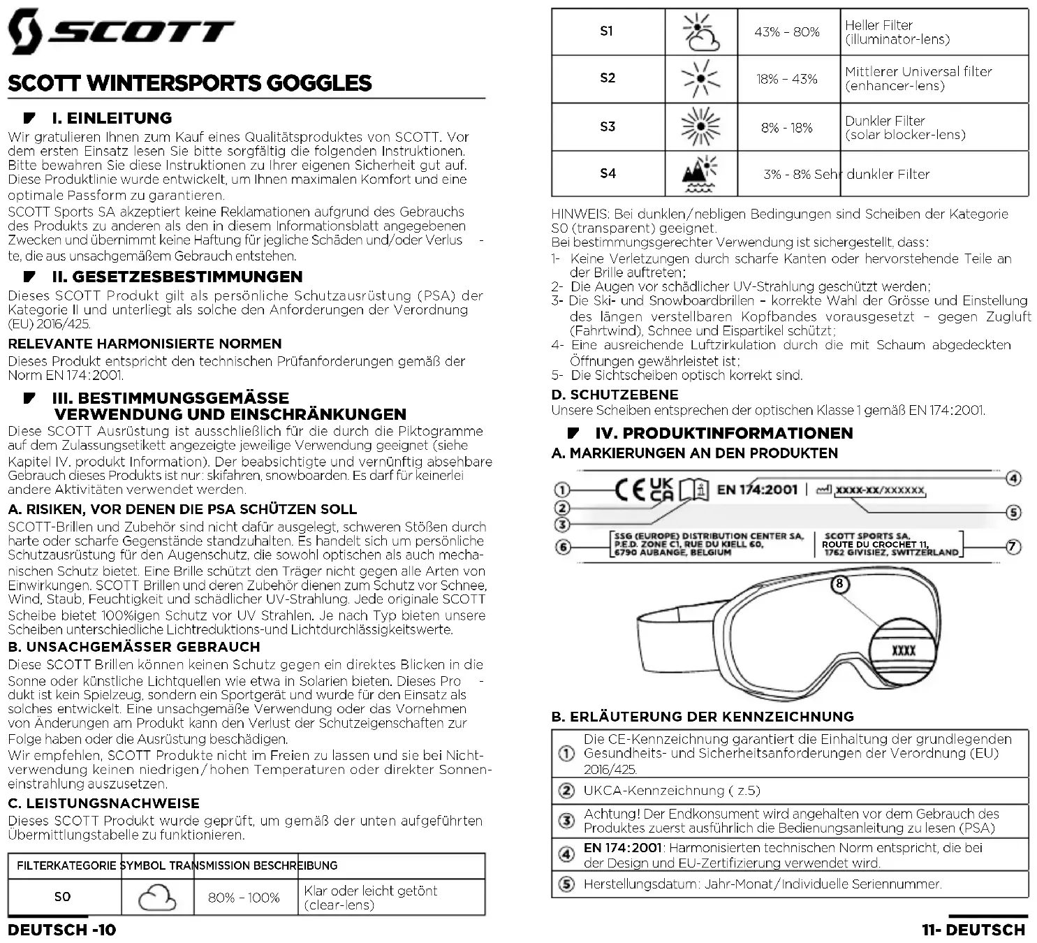 - I. EINLEITUNG Wir gratulieren Ihnen zum Kauf eines Qualitätsproduktes von SCOTT. Vor dem ersten Einsatz lesen Sie bitte sorgfältig die folgenden Instruktionen. Bitte bewahren Sie diese Instruktionen zu Ihrer eigenen Sicherheit gut auf. Diese Produktlinie wurde entwickelt, um Ihnen maximalen Komfort und eine optimale Passform zu garantieren. SCOTT Sports SA akzeptiert keine Reklamationen aufgrund des Gebrauchs des Produkts zu anderen als den in diesem Informationsblatt angegebenen Zwecken und übernimmt keine Haftung für jegliche Schäden und/oder Verlus