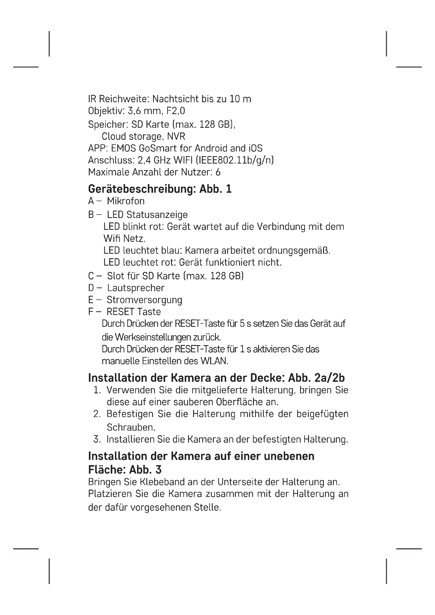 Installation der Kamera auf einer unebenen Fläche: Abb. 3 Bringen Sie Klebeband an der Unterseite der Halterung an. Platzieren Sie die Kamera zusammen mit der Halterung an der dafür vorgesehenen Stelle.Anbringen des Schutzstreifens: Abb. 4 Bei Bedarf kann auf den Rand der Kamera ein Schutzstreifen aufgeklebt werden, um eine eventuelle Beschädigung zu verhindern. Installation der App EMOS GoSmart: Abb. 5 Die App steht für Android und iOS zur Verfügung und ist über Google play und den App Store verfügbar. Zum Download der App scannen Sie bitte den entsprechenden QR-Code. Einstellen des Routers: Abb. 6 Die Kamera unterstützt nur 2.4 GHz Wi (5 GHz wird nicht unterstützt). Mobile App EMOS GoSmart: Abb. 5a Önen Sie die App EMOS GoSmart und bestätigen Sie die Datenschutzbestimmungen und klicken Sie auf „Ich stimme zu“. Abb. 5b Wählen Sie die Option Registrierung. Abb. 5c Geben Sie eine gültige E-Mail-Adresse ein und legen Sie ein Passwort fest. Bestätigen Sie Ihr Einverständnis mit den Datenschutzbes- timmungen. Klicken Sie auf Registrieren. Abb. 6a Wählen Sie die Option Gerät hinzufügen aus. Abb. 6b Wählen Sie die entsprechende Produktkategorie aus. Abb. 6c Wählen Sie den entsprechenden Produkttyp aus. Abb. 6d Schalten Sie die Stromzufuhr des Geräts ein.Abb. 6e Überzeugen Sie sich davon, dass die LED Diode am Gerät blinkt. Bestätigen durch Drücken der Taste Weiter. Abb. 6f Geben Sie Namen für das Wi-Fi-Netz und das Passwort ein. Bestätigen durch Drücken der Taste Weiter. Abb. 6g Auf dem Display Ihres mobilen Geräts wird ein QR Code angezeigt. Halten Sie den QR Code vor das Objektiv der Kameraeinheit. Bestätigen Sie, dass Sie das Tonsignal für die erfolgreiche Kopplung gehört haben. Abb. 6h Der Gerätesuchlauf erfolgt automatisch. Abb. 6i Das Gerät wurde gefunden. Bestätigen Sie mit der Taste Fertig. Konnektivität: Wi-Fi 2,4 GHz IEEE 802.11b/g/n Frequenzbereich: 2,400–2,4835 GHz Hiermit erklärt, EMOS spol. s r.o. dass der Funkanlagentyp H4051 der Richtlinie 2014/53/EU entspricht. Der vollständige Text der EU-Konformitätserklärung ist unter der folgenden Internetadresse verfügbar: http://www.emos.eu/download. Die Elektroverbraucher nicht als unsortierter Kommuna- labfall entsorgen, Sammelstellen für sortierten Abfall bzw. Müll benutzen. Setzen Sie sich wegen aktuellen Informa- tionen über die jeweiligen Sammelstellen mit örtlichen Behörden in Verbindung. Wenn Elektroverbraucher auf üblichen Mülldeponien gelagert werden, können Gefa- hrstoe ins Grundwasser einsickern und in den Lebensmitte- lumlauf gelangen, Ihre Gesundheit beschädigen und Ihre Gemüt- lichkeit verderben.UA | ІР Камера Вміст пакету: Камера / Блок живлення / Кабель USB / Держак / Скотч / Гвинти / Захисний пояс / Інструкція Технічні характеристики: Джерело живлення: DC 5 V/1 A Розміри: 57 × 57 × 71 мм Вага нетто: 180 г Роздільна здатність: 1 920 × 1 080 Сенсор: 1/2,9‘‘ 2 мегапікселя CMOS ІР відстань: Нічне бачення до 10 м Об‘єктив: 3,6 мм, F2,0 Зберігання: SD-карта (макс. 128 ГБ), Cloud storage, NVR APP: EMOS GoSmart для Android та iOS Підключення: 2,4 ГГц WIFI (IEEE802.11b/g/n) Максимальна кількість користувачів: 6 Опис пристрою: мал.1 A – Мікрофон B – Стан світлодіода Світлодіод мигає червоним: пристрій очікує підключення до мережі Wi-Fi. Світлодіод світить синій: камера працює правильно. Світлодіод світить червоним: пристрій не працює. C – Слот для SD-карти (макс. 128 ГБ) D – Репродуктор E – Блок живлення F – Кнопка RESET Натисніть кнопку RESET протягом 5секунд, щоб повернути пристрій до заводських налаштувань.Натисніть кнопку RESET до 1 секунди, щоб активувати режим ручного налаштування Wi-Fi. Встановлення камери на стелі: мал. 2a/2b