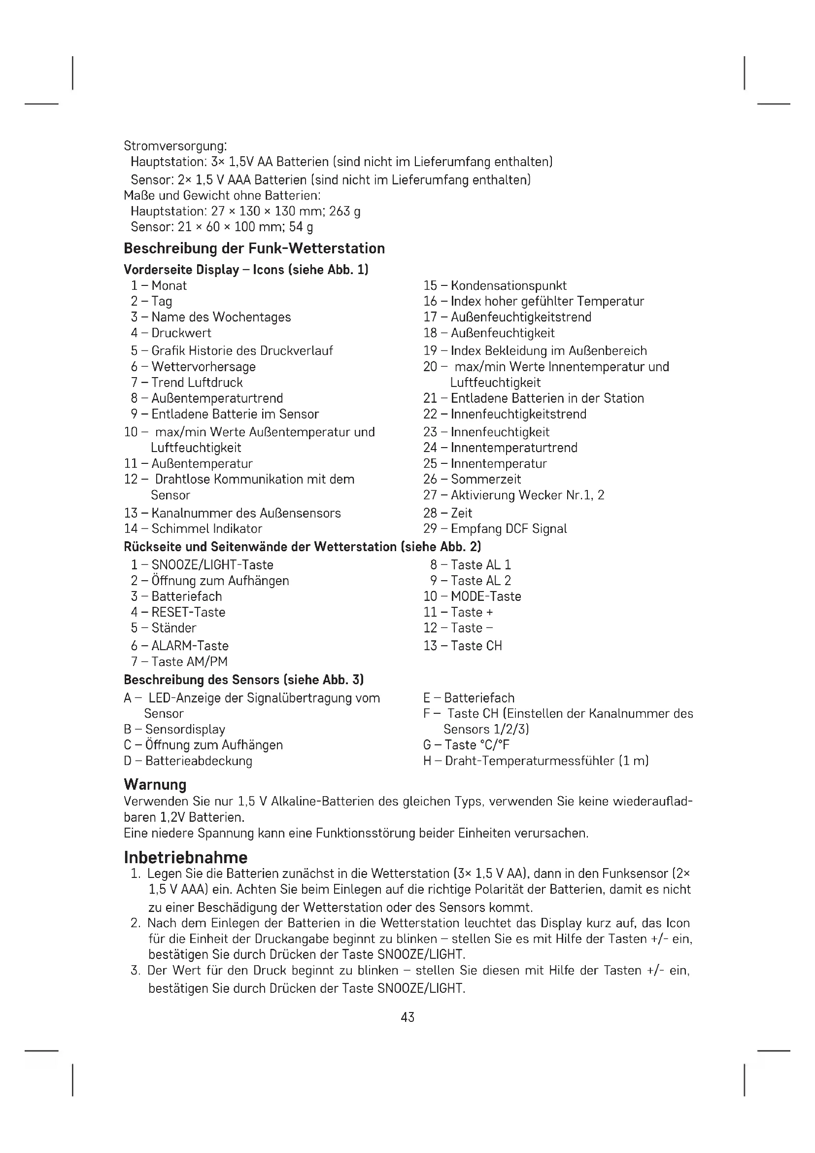 nat – Tag – Kalendersprache (GER, FRE, SPA, ITA, DAN, DUT, ENG) – Format der Datumsanzeige – Stunde – Minute. Zeitformat 12/24 h Durch wiederholtes Drücken der Taste AM/PM stellen Sie das Zeitformat 12 oder 24 h ein. Einstellen der Weckzeit Die Wetterstation ermöglicht das Einstellen von 2 unabhängigen Weckzeiten. Durch wiederholtes Drücken der Taste ALARM zeigen Sie die Weckzeit des Weckers Nr. 1 (A1) oder Nr. 2 (A2) an. Anschließend drücken Sie lange die Taste ALARM, die Zeiteinstellung beginnt zu blinken. Die Zeitwerte stellen Sie ein durch wiederholtes Drücken der Tasten + oder –, zur Bewegung im Menü drücken Sie erneut die Taste ALARM. So können Sie die Zeiten beider Wecker einstellen. Zur Aktivierung des Weckers Nr. 1 verschieben Sie die Taste AL 1 auf die Position ON. Es wird folgendes Symbol angezeigt . Zur Aktivierung des Weckers Nr. 2 verschieben Sie die Taste AL 2 auf die Position ON. Es wird folgendes Symbol angezeigt .46 Der Wecker wird dann in der eingestellten Zeit aktiviert. Zur Deaktivierung der Wecker verschieben Sie die Tasten AL 1/AL 2 auf die Position OFF. Wiederholtes Wecken/Schlummerfunktion (SNOOZE) Mit der SNOOZE/LIGHT-Taste, die sich im oberen Teil der Wetterstation bendet, verschieben Sie das Wecken um 5 Minuten. Betätigen Sie diese Taste, sobald der Wecker zu klingeln beginnt. Das Weckersymbol und ZZ werden blinken. Zum Abschalten der Funktion SNOOZE drücken Sie eine beliebige andere Taste außer SNOOZE/LIGHT – das Symbol hört auf zu blinken und wird weiterhin angezeigt. Am nächsten Tag wird der Wecker wieder aktiviert. Wird während des Weckerklingelns keine Taste betätigt, wird das Klingeln nach 2 Minuten beendet. Der Wecker klingelt am nächsten Tag. Displaybeleuchtung Betätigen Sie die SNOOZE/LIGHT-Taste um die Displaybeleuchtung für 10 Sekunden zu aktivieren. Einstellung der Temperatureinheiten °C/°F Durch wiederholtes Drücken der Taste MODE stellen Sie die gewünschte Temperatureinheit °C/°F ein. Anzeige der maximalen und der minimalen gemessenen Temperatur- und Luftfeuchtigkeitswerte Durch wiederholtes Betätigen der Taste + werden nacheinander die maximalen (Icon MAX) und die minimalen (Icon MIN) gemessenen Werte für Temperatur und Luftfeuchtigkeit angezeigt. Um den Messwertspeicher manuell zu löschen, halten Sie die Taste + lange gedrückt. Der Speicher wird jeden Tag um 00:00 automatisch gelöscht. Atmosphärischer Druck/Historie Die Station zeigt den Wert des atmosphärischen Drucks in hPa/inHg in Feld Nr. 4 an sowie ebenfalls den Druckverlauf der letzten 12 Stunden in Feld Nr. 5. Durch das Umsetzen der Wetterstation an einen anderen Ort kommt es zu einer Beeinussung der gemessenen Werte. Die Messung stabilisiert sich innerhalb von 12 Stunden ab dem Einsetzen der Batterie oder dem Umsetzen der Station. Einstellen von Druckeinheit/Druckwerten/Icons der Wettervorhersage Drücken Sie die Taste SNOOZE/LIGHT. Stellen Sie die Einheit für den Druck (hPa, inHg) ein mit den Tasten + und –. Bestätigen Sie durch Drücken der Taste SNOOZE/LIGHT. Danach können Sie den Wert für den Druck mit den Tasten + und – einstellen. Dient zur Präzisierung der Druckberechnung. Den Druckwert zu Ihrem Ort nden Sie beispielsweise im Internet. Bestätigen Sie den Wert durch Drücken der Taste SNOOZE/LIGHT. Das Wettervorhersagesymbol beginnt zu blinken. Stellen Sie das Icon entsprechend dem aktuellen Wetter mit Hilfe der Tasten + und – ein. Dient zur Präzisierung der Wettervorhersage. Bestätigen Sie durch Drücken der Taste SNOOZE/LIGHT. Anzeige von Schimmel/Taupunkt/gefühlter Temperatur