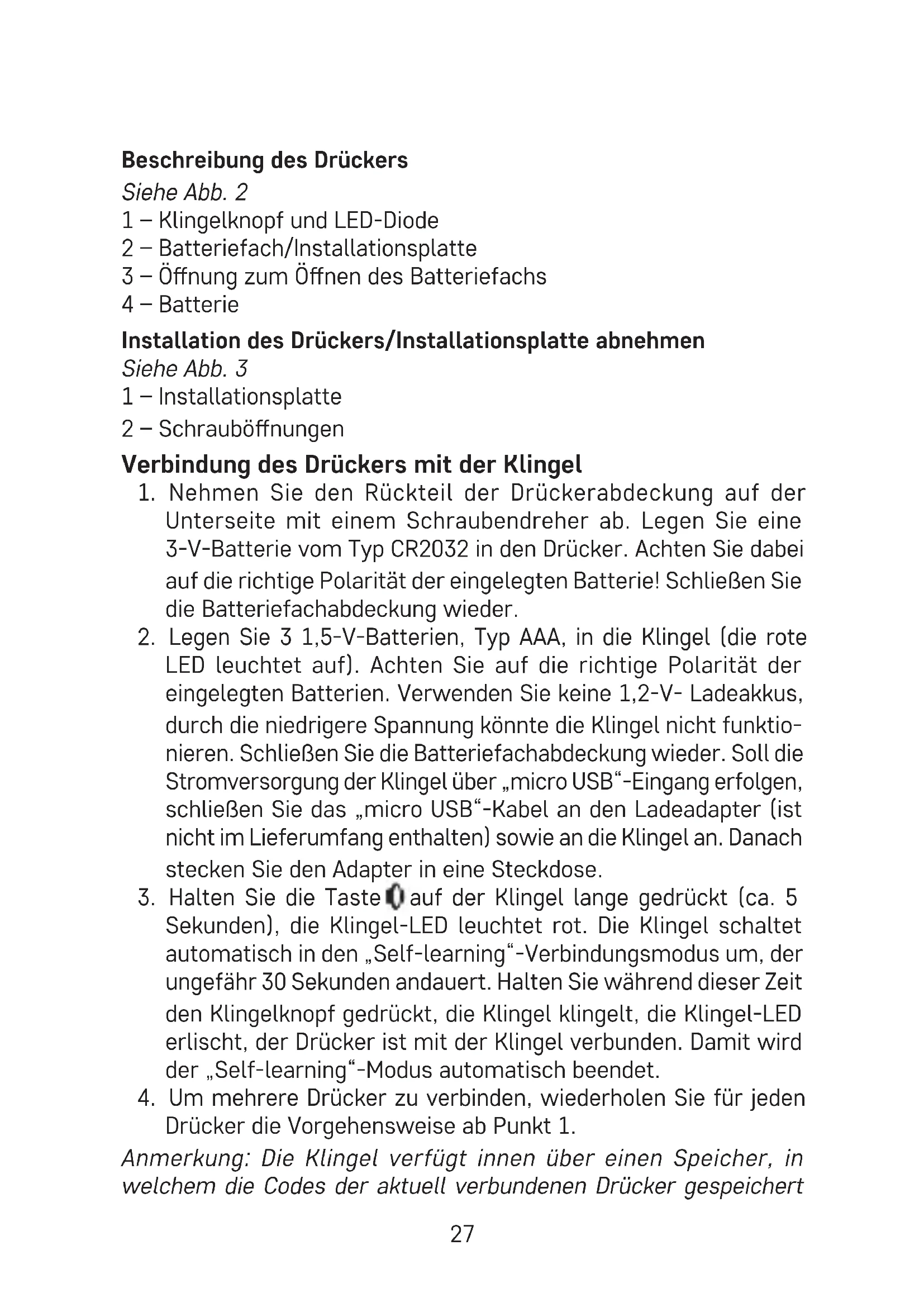 - Wird die Klingel über einen längeren Zeitraum nicht verwendet, nehmen Sie die Batterien aus der Klingel und dem Drücker.