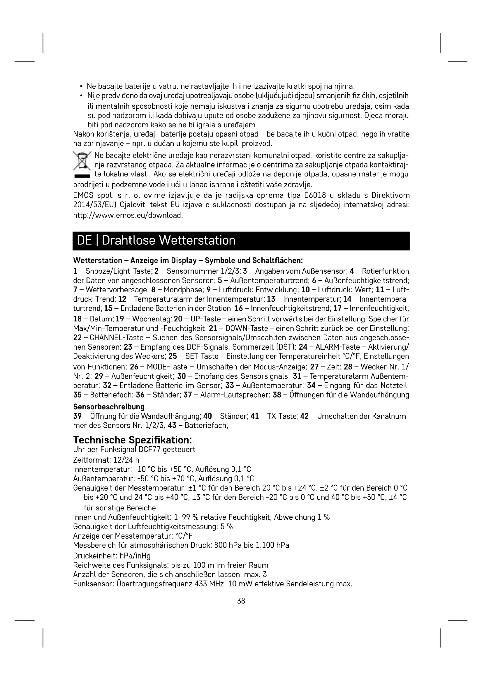 - Nije predviđeno da ovaj uređaj upotrebljavaju osobe (uključujući djecu) smanjenih zičkih, osjetilnih ili mentalnih sposobnosti koje nemaju iskustva i znanja za sigurnu upotrebu uređaja, osim kada su pod nadzorom ili kada dobivaju upute od osobe zadužene za njihovu sigurnost. Djeca moraju biti pod nadzorom kako se ne bi igrala s uređajem. Nakon korištenja, uređaj i baterije postaju opasni otpad – be bacajte ih u kućni otpad, nego ih vratite na zbrinjavanje – npr. u dućan u kojemu ste kupili proizvod. Ne bacajte električne uređaje kao nerazvrstani komunalni otpad, koristite centre za sakuplja- nje razvrstanog otpada. Za aktualne informacije o centrima za sakupljanje otpada kontaktiraj- te lokalne vlasti. Ako se električni uređaji odlože na deponije otpada, opasne materije mogu prodrijeti u podzemne vode i ući u lanac ishrane i oštetiti vaše zdravlje. EMOS spol. s r. o. ovime izjavljuje da je radijska oprema tipa E6018 u skladu s Direktivom 2014/53/EU) Cjeloviti tekst EU izjave o sukladnosti dostupan je na sljedećoj internetskoj adresi: http://www.emos.eu/download. DE | Drahtlose Wetterstation Wetterstation – Anzeige im Display – Symbole und Schaltächen: 1 – Snooze/Light-Taste; 2 – Sensornummer 1/2/3; 3 – Angaben vom Außensensor; 4 – Rotierfunktion der Daten von angeschlossenen Sensoren; 5 – Außentemperaturtrend; 6 – Außenfeuchtigkeitstrend; 7 – Wettervorhersage; 8 – Mondphase; 9 – Luftdruck: Entwicklung; 10 – Luftdruck: Wert; 11 – Luft- druck: Trend; 12 – Temperaturalarm der Innentemperatur; 13 – Innentemperatur; 14 – Innentempera- turtrend; 15 – Entladene Batterien in der Station; 16 – Innenfeuchtigkeitstrend; 17 – Innenfeuchtigkeit; 18 – Datum; 19 – Wochentag; 20 – UP-Taste – einen Schritt vorwärts bei der Einstellung, Speicher für Max/Min-Temperatur und -Feuchtigkeit; 21 – DOWN-Taste – einen Schritt zurück bei der Einstellung; 22 – CHANNEL-Taste – Suchen des Sensorsignals/Umscahlten zwischen Daten aus angeschlosse- nen Sensoren; 23 – Empfang des DCF-Signals, Sommerzeit (DST); 24 – ALARM-Taste – Aktivierung/ Deaktivierung des Weckers; 25 – SET-Taste – Einstellung der Temperatureinheit °C/°F, Einstellungen von Funktionen; 26 – MODE-Taste – Umschalten der Modus-Anzeige; 27 – Zeit; 28 – Wecker Nr. 1/ Nr. 2; 29 – Außenfeuchtigkeit; 30 – Empfang des Sensorsignals; 31 – Temperaturalarm Außentem- peratur; 32 – Entladene Batterie im Sensor; 33 – Außentemperatur; 34 – Eingang für das Netzteil; 35 – Batteriefach; 36 – Ständer; 37 – Alarm-Lautsprecher; 38 – Önungen für die Wandaufhängung Sensorbeschreibung 39 – Önung für die Wandaufhängung; 40 – Ständer; 41 – TX-Taste; 42 – Umschalten der Kanalnum- mer des Sensors Nr. 1/2/3; 43 – Batteriefach; Technische Spezikation: Uhr per Funksignal DCF77 gesteuert Zeitformat: 12/24 h Innentemperatur: -10°C bis +50°C, Auösung 0,1°C Außentemperatur: -50°C bis +70°C, Auösung 0,1°C Genauigkeit der Messtemperatur: ±1°C für den Bereich 20°C bis +24°C, ±2°C für den Bereich 0°C bis +20°C und 24°C bis +40°C, ±3°C für den Bereich -20°C bis 0°C und 40°C bis +50°C, ±4°C für sonstige Bereiche. Innen und Außenfeuchtigkeit: 1–99 % relative Feuchtigkeit, Abweichung 1 % Genauigkeit der Luftfeuchtigkeitsmessung: 5 % Anzeige der Messtemperatur: °C/°F Messbereich für atmosphärischen Druck: 800 hPa bis 1.100 hPa Druckeinheit: hPa/inHg Reichweite des Funksignals: bis zu 100 m im freien Raum Anzahl der Sensoren, die sich anschließen lassen: max. 3 Funksensor: Übertragungsfrequenz 433 MHz, 10 mW eektive Sendeleistung max.39 Stromversorgung der Station: 3×1,5 V AAA (sind nicht im Lieferumfang enthalten) Adapter AC 230 V/DC 5 V, 300 mA (im Lieferumfang enthalten) Stromversorgung des Sensors: 2×1,5 V AAA (sind nicht im Lieferumfang enthalten) Maße und Gewicht der Station: 17×192×127 mm, 364 g Maße und Gewicht des Sensors: 15 × 62 × 100 mm, 54 g Inbetriebnahme
