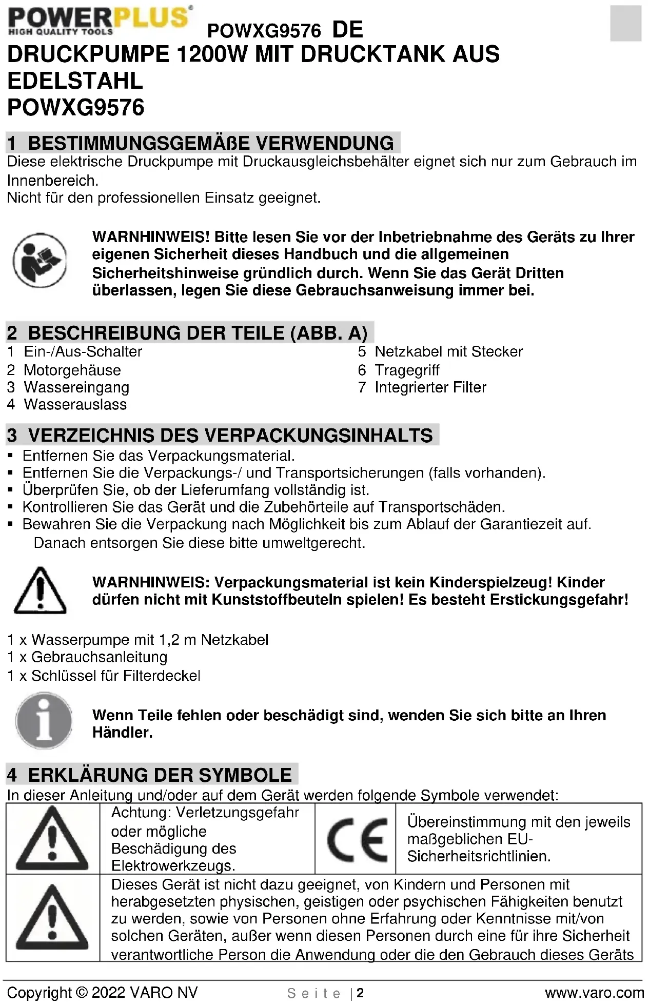 - Die Pumpe ist für den Gebrauch in Swimming Pools, Teichen, Bädern und bei anderen Umständen nicht geeignet, in denen Personen mit dem Wasser in Berührung kommen können, und sie darf daher für solche Zwecke nicht verwendet werden.POWXG9576 DE Copyright © 2022 VARO NV S e i t e | 5 www.varo.com