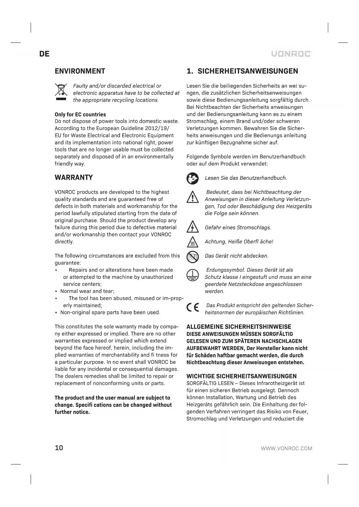 - Es wurden keine Original-Ersatzteile verwendet. Dies stellt die einzige Gewährleistung des Unternehmens dar, sowohl ausdrücklich als auch implizit. Es gibt keine anderen ausdrücklichen oder stillschweigenden Garantien, die über das hier Genannte hinausgehen, einschließlich der still- schweigenden Garantien der Marktgängigkeit oder Eignung für einen bestimmten Zweck. In keinem Fall ist VONROC haftbar für Neben- oder Folgeschä- den. Die Rechtsmittel des Händlers beschränken sich auf Reparatur oder Ersatz fehlerhafter Ein- heiten oder Teile. Am Produkt und am Benutzerhandbuch können Än- derungen vorgenommen werden. Die technischen Daten können sich ohne Vorankündigung ändern.16