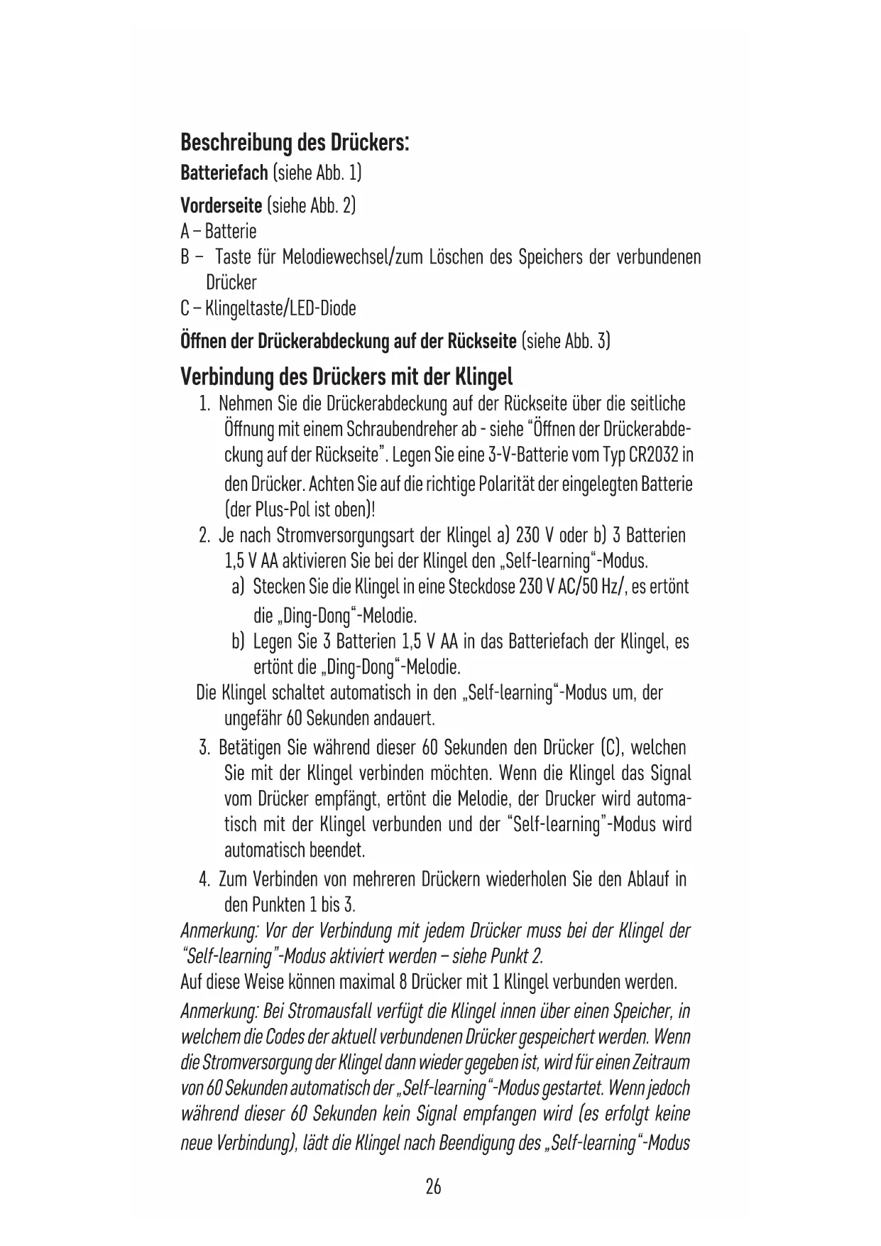 1,5 V AA aktivieren Sie bei der Klingel den „Self-learning“-Modus. a) Stecken Sie die Klingel in eine Steckdose 230 V AC/50 Hz/, es ertönt die „Ding-Dong“-Melodie. b) Legen Sie 3 Batterien 1,5 V AA in das Batteriefach der Klingel, es ertönt die „Ding-Dong“-Melodie. Die Klingel schaltet automatisch in den „Self-learning“-Modus um, der ungefähr 60 Sekunden andauert.
