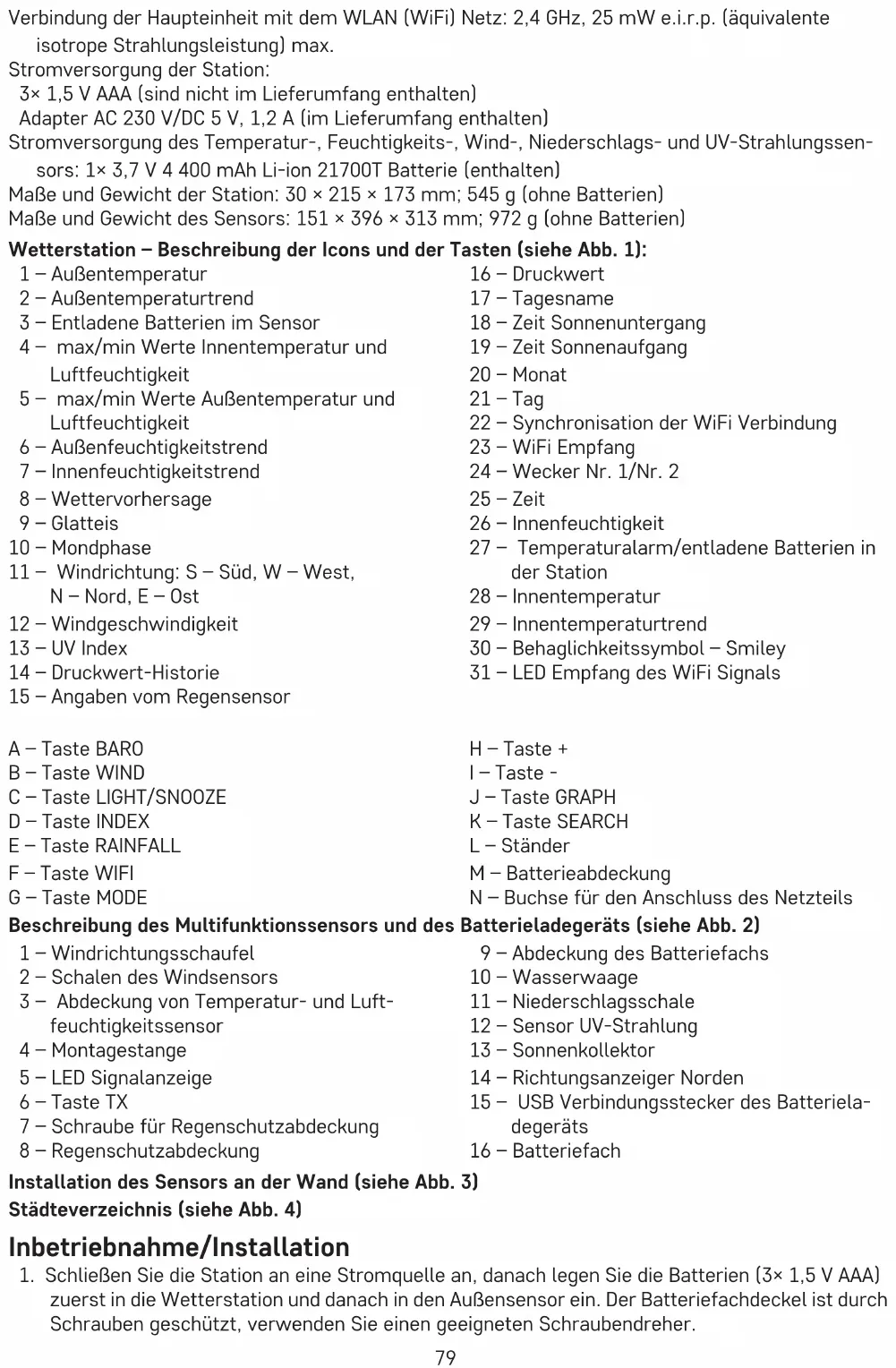 zuerst in die Wetterstation und danach in den Außensensor ein. Der Batteriefachdeckel ist durch Schrauben geschützt, verwenden Sie einen geeigneten Schraubendreher.80