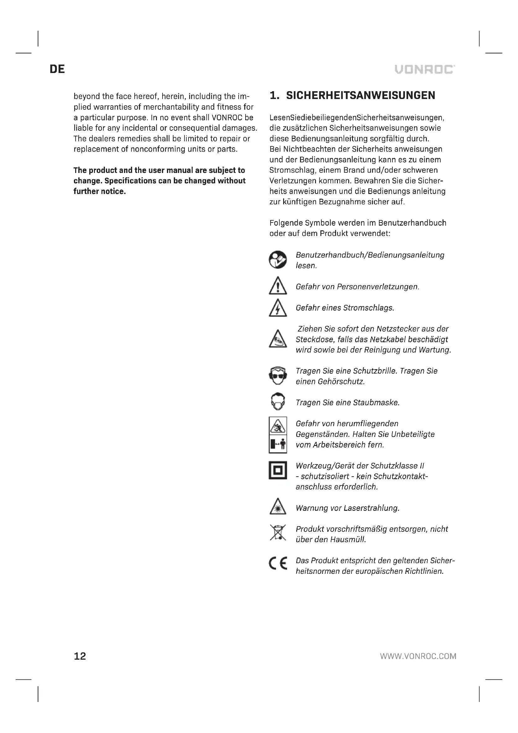 Es wurden keine Original-Ersatzteile verwendet. Dies stellt die einzige Gewährleistung des Unterne- hmens dar, sowohl ausdrücklich als auch implizit. Es gibt keine anderen ausdrücklichen oder stillsch- weigenden Garantien, die über das hier Genannte hinausgehen, einschließlich der stillschweigenden Garantien der Marktgängigkeit oder Eignung für einen bestimmten Zweck. In keinem Fall ist VONROC haftbar für Neben- oder Folgeschäden. Die Rechts- mittel des Händlers beschränken sich auf Reparatur oder Ersatz fehlerhafter Einheiten oder Teile. Am Produkt und am Benutzerhandbuch können Än- derungen vorgenommen werden. Die technischen Daten können sich ohne Vorankündigung ändern.