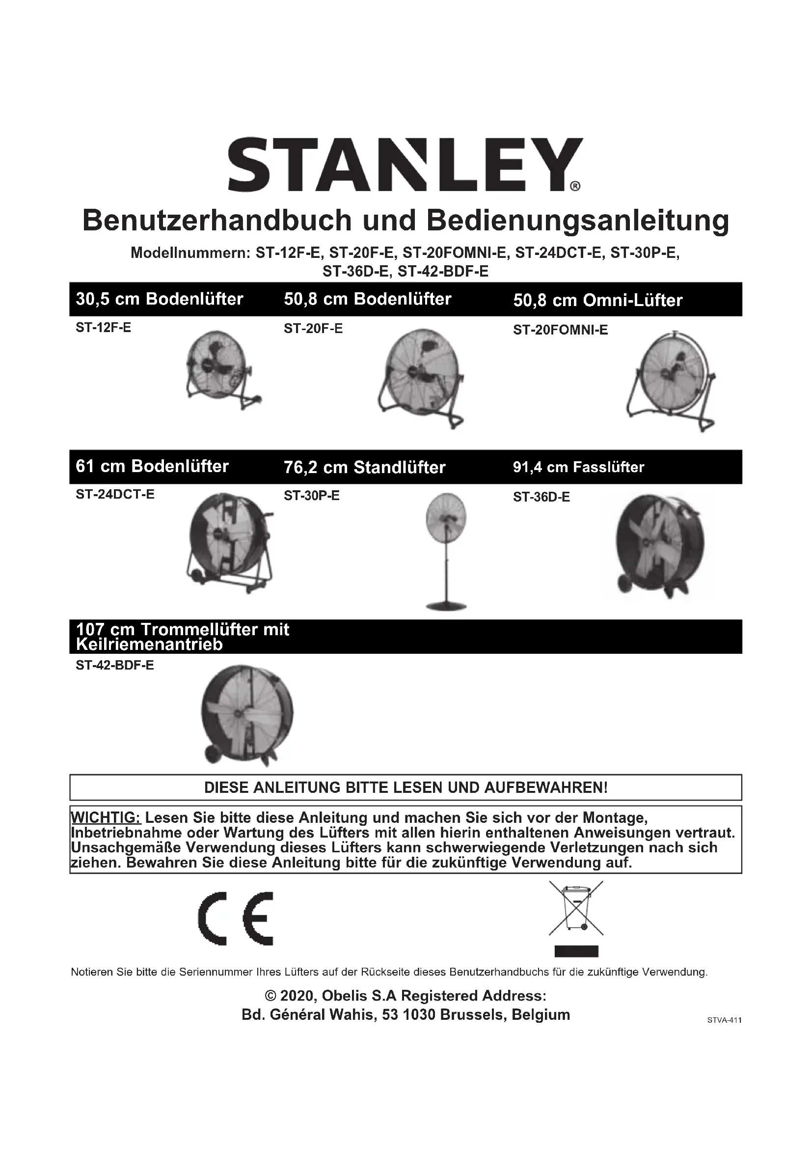 Benutzerhandbuch und Bedienungsanleitung 30,5 cm Bodenlüfter ST-12F-E 50,8 cm Bodenlüfter ST-20F-E 50,8 cm Omni-Lüfter ST-20FOMNI-E 76,2 cm Standlüfter ST-30P-E 61 cm Bodenlüfter ST-24DCT-E 91,4 cm Fasslüfter ST-36D-E STVA-411 107 cm Trommellüfter mit Keilriemenantrieb ST-42-BDF-E2 LASSEN SIE DEN LÜFTER NIEMALS UNBEAUFSICHTIGT, WENN ER AN DAS STROMNETZ ANGESCHLOSSEN IST ODER SICH IN BETRIEB BEFINDET! © 2020, Obelis S.A Registered Address: Bd. Général Wahis, 53 1030 Brussels, Belgium Stanley, das STANLEY-Logo, das eingekerbte Rechteck sowie das gelb-schwarze diagonale Paketdesign sind Markenzeichen von Stanley Black & Decker, Inc. oder ihrer Tochterunternehmen. Zur Vermeidung von Brandgefahr und zur ordnungsgemäßen Abluft sicherstellen, dass für eine ausreichende Luftabfuhr nach außen gesorgt ist. Die Abluft nicht in Zwischenräume von Wänden oder Decken oder auf Dachböden, in Zwischendecken oder Garagen leiten. Lüfter nicht bei beschädigtem Kabel oder Stecker betreiben! Lüfter außer Betrieb nehmen beziehungsweise zur Überprüfung und/oder Reparatur einer zugelas- senen Fachwerkstatt überlassen. Kabel nicht unter Bodenbelägen verlegen. Nicht unter Teppichen, Läufern oder ähnlichen Abdeckungen führen. Kabel nicht unter Möbeln oder Geräten hindurchführen. Kabel nicht über Laufstrecken führen, da sonst Stolpergefahr besteht. Um die Gefahr von Stromschlägen zu minimieren, vor Wasser/Regen schützen und nicht in feuchten Umgebungen verwenden. Sicherheitshinweise ACHTUNG: LESEN SIE BITTE VOR DER MONTAGE, WARTUNG ODER VERWENDUNG DES LÜFTERS ALLE ANWEISUNGEN SORGFÄLTIG DURCH. DAS NICHTBEACHTEN DIESER ANLEITUNG KANN ZU SCHWERWIEGENDEN VERLETZUNGEN UND/ODER MATERIELLEN SCHÄDEN FÜHREN. DIESER LÜFTER IST EIN ELEKTROGERÄT UND KEIN SPIELZEUG! UM DAS PERSÖNLICHE VERLETZUNGSRISIKO UND DIE GEFAHR EINES STROMSCHLAGS ZU MINIMIEREN, DARF DER LÜFTER NICHT ZWECKENTFREMDET UND NICHT IN DER REICHWEITE VON KINDERN AUFGESTELLT WERDEN. Um Stromschläge während des Betriebs zu verhindern, vermeiden Sie den Kontakt des Lüfters mit anderen schutzgeerdeten Objekten, wie beispielsweise Rohrleitungen, Heizkörper usw. Gefahr von Bränden, Stromschlägen oder Verletzungen beim Betrieb oder bei der Wartung. Trennen Sie den Lüfter vor Wartungstätigkeiten vom Stromnetz. VORSICHT! Automatisch betriebenes Gerät – zur Minimierung der Verletzungsgefahr vor Wartungstätigkeiten vom Stromnetz trennen! Um die Gefahr von Bränden oder Stromschlägen zu minimieren, verwenden Sie den Lüfter nicht mit transistorgesteuerten Drehzahlreglern. Um die Gefahr von Stromschlägen und Verletzungen von Personen zu minimieren, nicht in einem Fenster verwenden. Nur zur allgemeinen Entlüftung. Nicht zur Entlüftung gefährlicher oder explo- sionsfähiger Stoffe und Dämpfe verwenden. Verwenden Sie den Lüfter niemals in Umgebungen, die Stoffe wie Benzin, Lösemittel, Farbverdünner, Staubpartikel, flüchtige oder aerogene brennbare Stoffe oder sonstige unbekannte Chemikalien enthalten.3 LASSEN SIE DEN LÜFTER NIEMALS UNBEAUFSICHTIGT, WENN ER AN DAS STROMNETZ ANGESCHLOSSEN IST ODER SICH IN BETRIEB BEFINDET! © 2020, Obelis S.A Registered Address: Bd. Général Wahis, 53 1030 Brussels, Belgium Sicherheitshinweise - Vor der Inbetriebnahme den Lüfter immer auf lose oder beschädigte Teile überprüfen. Netzanschlusskabel auf Schäden überprüfen. Den Lüfter niemals verwenden, wenn Teile beschä- digt sind oder fehlen. Den Lüfter niemals ohne Anbringen der Schutzvorrichtungen betreiben. - Nur an Stromnetzen mit 220-240 Volt 50 Hz (Netzfrequenz) mit mindestens 15 A Stromstärke betreiben. - Beim Verwenden eines Verlängerungskabels nur ein Kabel mit der vorgeschriebenen Stromstärke (Strombelastbarkeit in Ampere), UL-Zertifizierung sowie einer Steckdose mit Schutzerde verwenden, die zum Stecker des Netzanschlusskabels passt. Netzanschlusskabel und Verlängerungskabel immer vor Hitze, Öl und scharfen Kanten schützen. Netzanschlusskabel regelmäßig überprüfen und bei Beschädigung ersetzen. Um die Gefahr von Stromschlägen zu minimieren, vor Wasser/Regen schützen und nicht in feuchten Umgebungen verwenden. Die Installation und der elektrische Anschluss muss von einer oder mehreren quali- fizierten Personen entsprechend den maßgeblichen Gesetzen und Vorschriften vorgenommen werden. Falls zum Warten oder Ersetzen eines Bauteils eine Sicherheitseinrichtung entfernt oder von ihrem Anschluss getrennt werden muss, muss diese Sicherheitseinrichtung in der gleiche Weise wieder installiert oder montiert werden, wie sie vor der ersten Inbetriebnahme dieses Lüfters installiert war. Lüfter nicht bei beschädigtem Kabel oder Stecker betreiben! Lüfter außer Betrieb nehmen beziehungsweise zur Überprüfung und/oder Reparatur einer zugelassenen Fachwerkstatt überlassen. Kabel nicht unter Bodenbelägen verlegen. Kabel nicht unter Teppichen, Läufern oder ähnlichen Abdeckungen führen. Kabel nicht unter Möbeln oder Geräten hindurchfüh- ren. Kabel nicht über Laufstrecken führen, da sonst Stolpergefahr besteht.