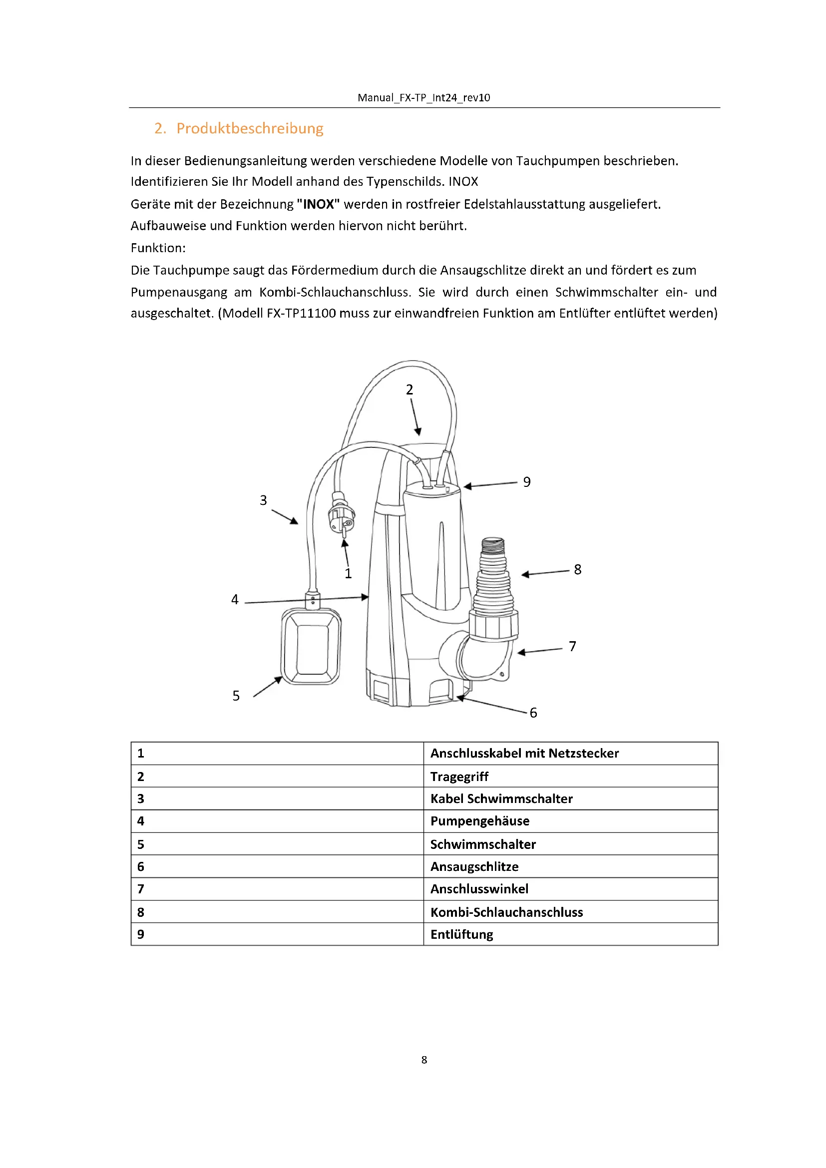 In dieser Bedienungsanleitung werden verschiedene Modelle von Tauchpumpen beschrieben. Identifizieren Sie Ihr Modell anhand des Typenschilds. INOX Geräte mit der Bezeichnung "INOX" werden in rostfreier Edelstahlausstattung ausgeliefert. Aufbauweise und Funktion werden hiervon nicht berührt. Funktion: Die Tauchpumpe saugt das Fördermedium durch die Ansaugschlitze direkt an und fördert es zum Pumpenausgang am Kombi-Schlauchanschluss. Sie wird durch einen Schwimmschalter ein- und ausgeschaltet. (Modell FX-TP11100 muss zur einwandfreien Funktion am Entlüfter entlüftet werden)