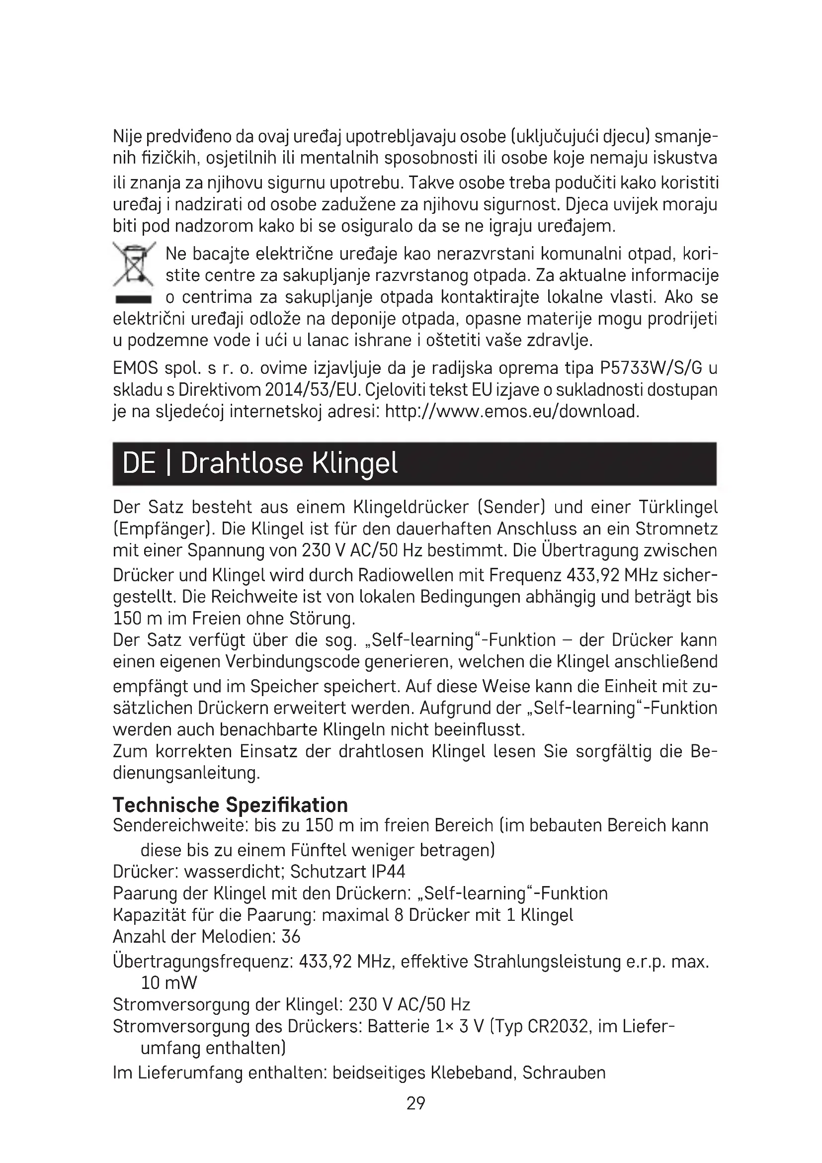 - Za čišćenje uređaja koristite blago navlaženu krpu s malo deterdženta; ne upotrebljavajte agresivna sredstva za čišćenje ili otapala.29 Nije predviđeno da ovaj uređaj upotrebljavaju osobe (uključujući djecu) smanje- nih zičkih, osjetilnih ili mentalnih sposobnosti ili osobe koje nemaju iskustva ili znanja za njihovu sigurnu upotrebu. Takve osobe treba podučiti kako koristiti uređaj i nadzirati od osobe zadužene za njihovu sigurnost. Djeca uvijek moraju biti pod nadzorom kako bi se osiguralo da se ne igraju uređajem. Ne bacajte električne uređaje kao nerazvrstani komunalni otpad, kori- stite centre za sakupljanje razvrstanog otpada. Za aktualne informacije o centrima za sakupljanje otpada kontaktirajte lokalne vlasti. Ako se električni uređaji odlože na deponije otpada, opasne materije mogu prodrijeti u podzemne vode i ući u lanac ishrane i oštetiti vaše zdravlje. EMOS spol. s r. o. ovime izjavljuje da je radijska oprema tipa P5733W/S/G u skladu s Direktivom 2014/53/EU. Cjeloviti tekst EU izjave o sukladnosti dostupan je na sljedećoj internetskoj adresi: http://www.emos.eu/download. DE | Drahtlose Klingel Der Satz besteht aus einem Klingeldrücker (Sender) und einer Türklingel (Empfänger). Die Klingel ist für den dauerhaften Anschluss an ein Stromnetz mit einer Spannung von 230 V AC/50 Hz bestimmt. Die Übertragung zwischen Drücker und Klingel wird durch Radiowellen mit Frequenz 433,92 MHz sicher- gestellt. Die Reichweite ist von lokalen Bedingungen abhängig und beträgt bis 150 m im Freien ohne Störung. Der Satz verfügt über die sog. „Self-learning“-Funktion – der Drücker kann einen eigenen Verbindungscode generieren, welchen die Klingel anschließend empfängt und im Speicher speichert. Auf diese Weise kann die Einheit mit zu- sätzlichen Drückern erweitert werden. Aufgrund der „Self-learning“-Funktion werden auch benachbarte Klingeln nicht beeinusst. Zum korrekten Einsatz der drahtlosen Klingel lesen Sie sorgfältig die Be- dienungsanleitung. Technische Spezikation Sendereichweite: bis zu 150 m im freien Bereich (im bebauten Bereich kann diese bis zu einem Fünftel weniger betragen) Drücker: wasserdicht; Schutzart IP44 Paarung der Klingel mit den Drückern: „Self-learning“-Funktion Kapazität für die Paarung: maximal 8 Drücker mit 1 Klingel Anzahl der Melodien: 36 Übertragungsfrequenz: 433,92 MHz, eektive Strahlungsleistung e.r.p. max. 10 mW Stromversorgung der Klingel: 230 V AC/50 Hz Stromversorgung des Drückers: Batterie 1× 3 V (Typ CR2032, im Liefer- umfang enthalten) Im Lieferumfang enthalten: beidseitiges Klebeband, Schrauben30 Beschreibung der Klingel (siehe Abb. 1) 1 – Klingel-LED-Diode 2 – Taste zum Einstellen der Lautstärke 3 – Taste zur Änderung der Melodie Beschreibung des Drückers (siehe Abb. 2) 1 – Klingeltaste und LED Diode 2 – Batteriefach/Montageauage 3 – Önung zum Önen des Batteriefachs 4 – Batterie Installation des Drückers/Abnehmen der Montageauage (siehe Abb. 3) 1 – Montageauage 2 – Löcher für Schrauben Verbindung des Drückers mit der Klingel