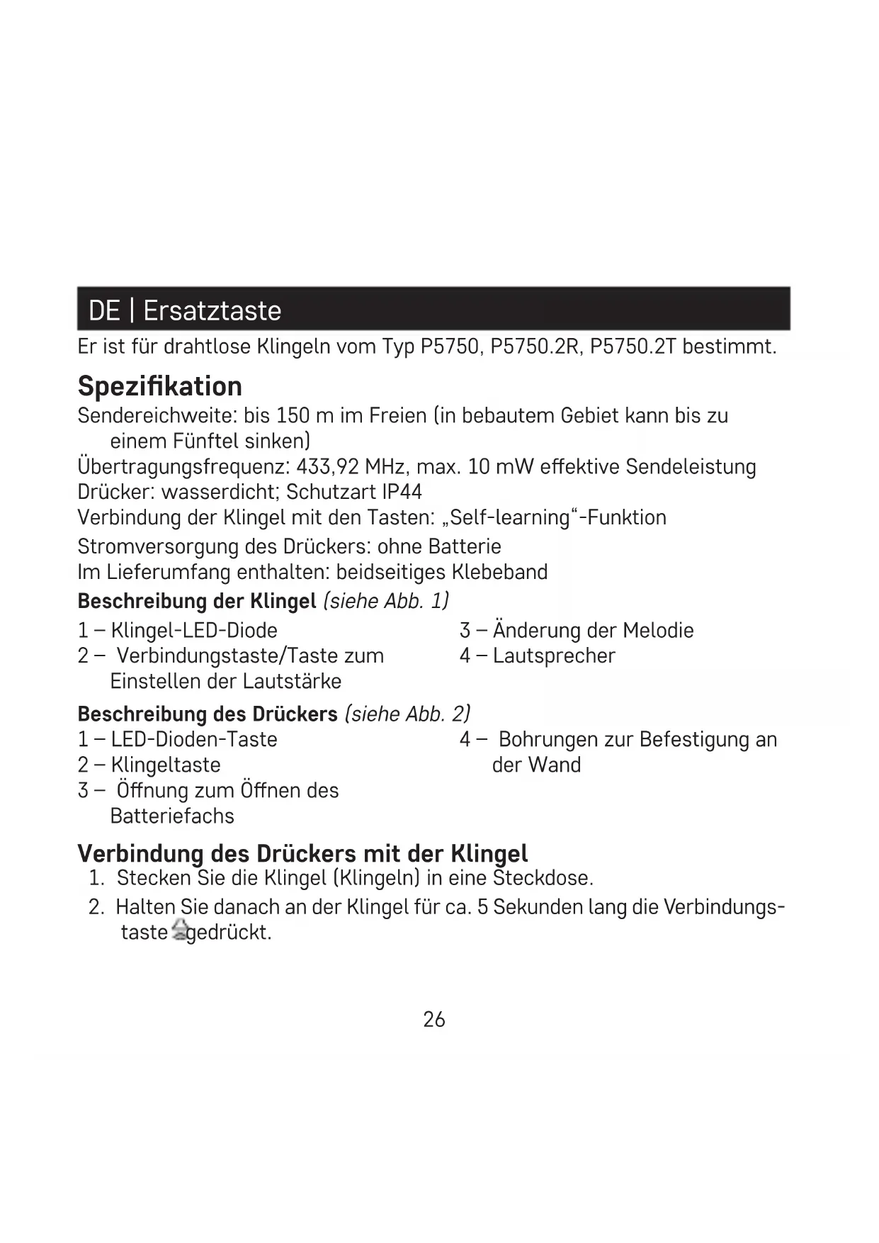 Vorgehensweise ab Punkt 1. Anmerkung: Bei Stromausfall verfügt die Klingel über einen internen Speicher, in welchem die Codes der aktuell verbundenen Drücker gespeichert werden. Nach einem Stromausfall muss somit keine neue Verbindung erfolgen. Löschen des Speichers der verbundenen Drücker Betätigen Sie auf der Klingel die Verbindungstaste und halten Sie diese gedrückt. Stecken Sie die Klingel in die Steckdose. Wenn nach ca. 5 Sekunden die LED der Klingel aueuchtet, lassen Sie die Taste los, die LED erlischt. Der Speicher aller verbundenen Drücker wird gelöscht. Installation des Klingeldrückers (des Senders)