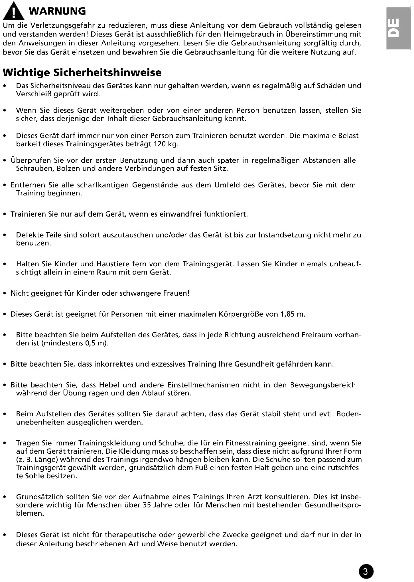 - Dieses Gerät darf immer nur von einer Person zum Trainieren benutzt werden. Die maximale Belast- barkeit dieses Trainingsgerätes beträgt 120 kg.