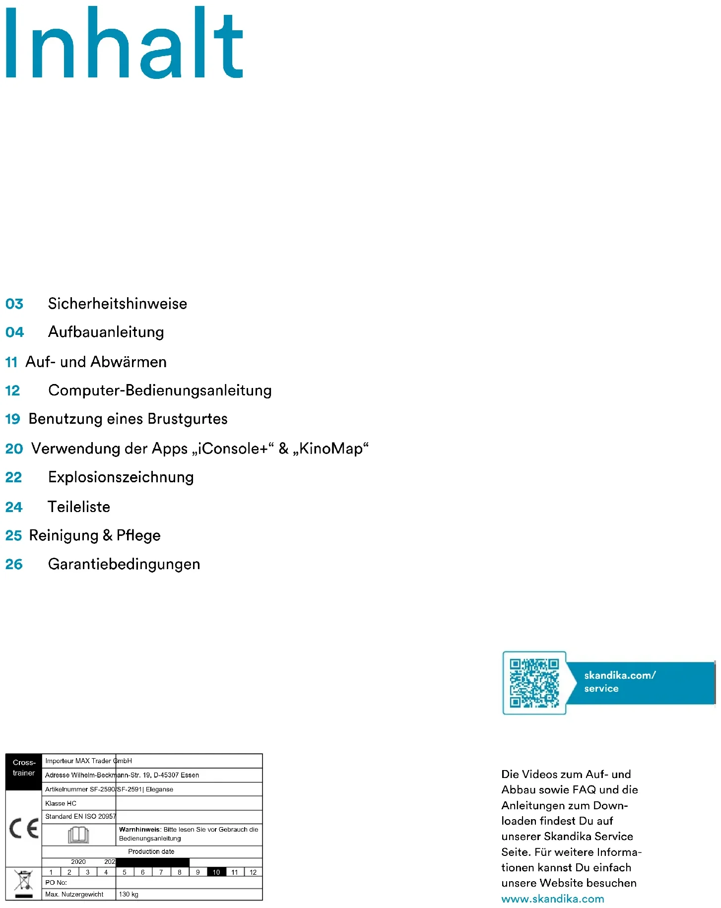 Eleganse Art.Nr. SF-2590 / SF-259103 Sicherheitshinweise 04 Aufbauanleitung 11 Auf- und Abwärmen 12 Computer-Bedienungsanleitung 19 Benutzung eines Brustgurtes 20 Verwendung der Apps „iConsole+“ & „KinoMap“ 22 Explosionszeichnung 24 Teileliste 25 Reinigung & Pege 26 Garantiebedingungen skandika.com/ service Inhalt Die Videos zum Auf- und Abbau sowie FAQ und die Anleitungen zum Down- loaden findest Du auf unserer Skandika Service Seite. Für weitere Informa- tionen kannst Du einfach unsere Website besuchen www.skandika.com Cross- trainer Importeur MAX Trader GmbHAdresse Wilhelm-Beckmann-Str. 19, D-45307 EssenArtikelnummer SF-2590/SF-2591| EleganseKlasse HCStandard EN ISO 20957Warnhinweis: Bitte lesen Sie vor Gebrauch die BedienungsanleitungProduction date2020 2021 2022 PO No:Max. Nutzergewicht 130 kg3