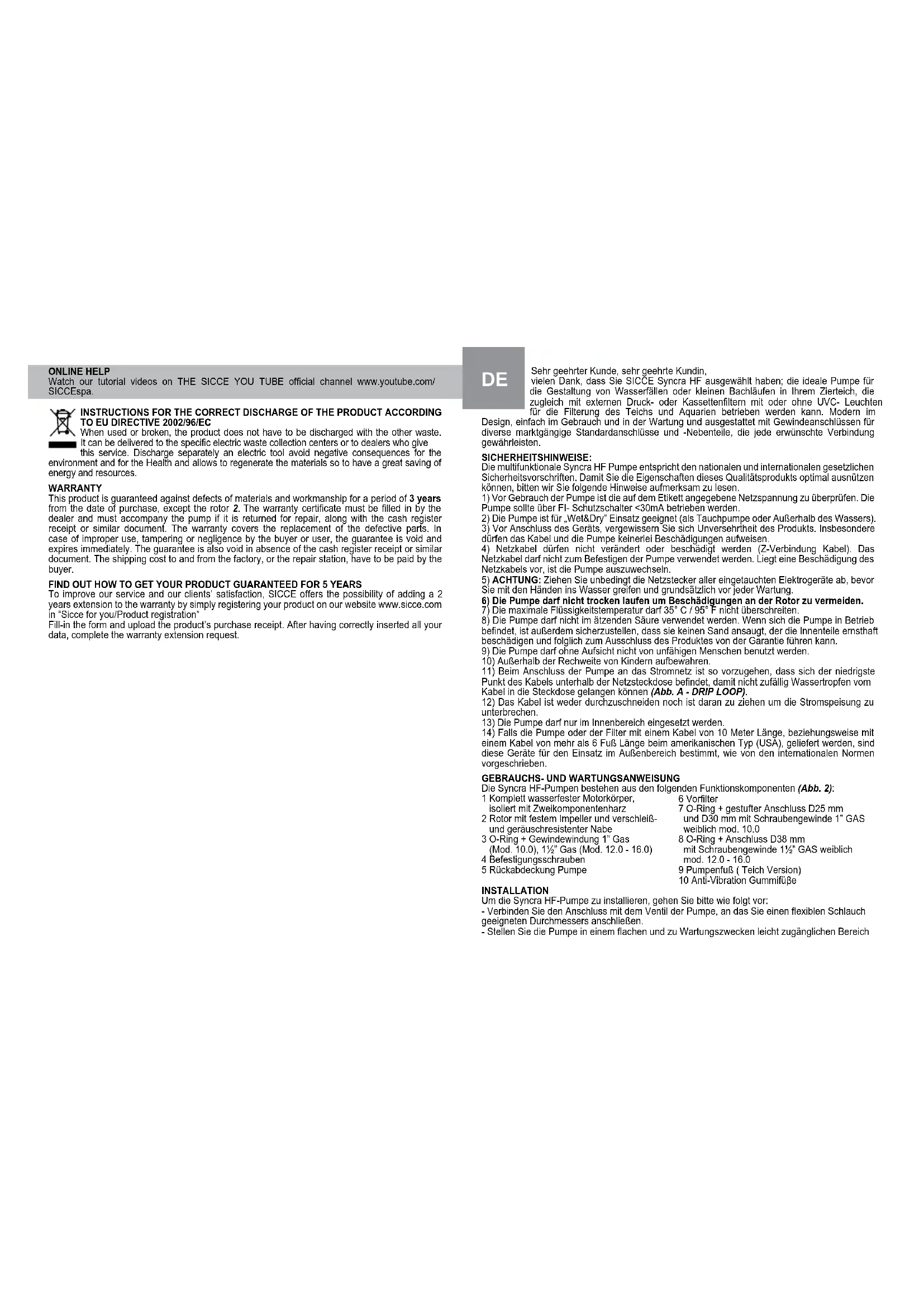 When used or broken, the product does not have to be discharged with the other waste. It can be delivered to the specic electric waste collection centers or to dealers who give this service. Discharge separately an electric tool avoid negative consequences for the environment and for the Health and allows to regenerate the materials so to have a great saving of energy and resources. WARRANTY This product is guaranteed against defects of materials and workmanship for a period of 3 years from the date of purchase, except the rotor 2. The warranty certicate must be lled in by the dealer and must accompany the pump if it is returned for repair, along with the cash register receipt or similar document. The warranty covers the replacement of the defective parts. In case of improper use, tampering or negligence by the buyer or user, the guarantee is void and expires immediately. The guarantee is also void in absence of the cash register receipt or similar document. The shipping cost to and from the factory, or the repair station, have to be paid by the buyer. FIND OUT HOW TO GET YOUR PRODUCT GUARANTEED FOR 5 YEARS To improve our service and our clients’ satisfaction, SICCE offers the possibility of adding a 2 years extension to the warranty by simply registering your product on our website www.sicce.com in “Sicce for you/Product registration” Fill-in the form and upload the product’s purchase receipt. After having correctly inserted all your data, complete the warranty extension request. 6 Vorlter 7 O-Ring + gestufter Anschluss D25 mm und D30 mm mit Schraubengewinde 1” GAS weiblich mod. 10.0 8 O-Ring + Anschluss D38 mm mit Schraubengewinde 1½” GAS weiblich mod. 12.0 - 16.0 9 Pumpenfuß ( Teich Version) 10 Anti-Vibration Gummifüβedes Teichs auf. - Die Pumpe funktioniert sowohl in horizontaler als auch in vertikaler Position. - Wenn die Pumpe getaucht verwendet wird (und nicht Inline), soll die Pumpe immer vollständig getaucht werden (Abb. 3). - Verlegen Sie das Versorgungskabel an einer Stelle, wo es nicht beschädigt werden kann. - Verbinden Sie den Stecker mit einer Steckdose, deren Spannung dem technischen Datenblatt entspricht. INLINE (Trocken) ANWENDUNG Es wird empfohlen, die Pumpe in einem belüftenden Bereich zu legen. Legen Sie die Pumpe nicht direkt im Wärmequellen. Stellen Sie die Pumpe so zu lange Hydraulikleitungen zu verhindern, die die Leistung reduzieren würde. Stellen Sie die Pumpe über das Wasserniveau. Schäden, die durch die Pumpe Trockenlauf verursacht wurden, sind von der Garantie ausgeschlossen. Um die Leistung der Pumpe vollastandig zu nutzen, wählen Sie eine gerade Einlaufrohr die auf Gewinde verbunden werden kann (Abb. 4). Wir empfehlen, Ein- und Auslaufrohre mit einem Durchmesser von genau oder größer als der Durchmesser der Gewinde zu verwenden (Abb. 5). Verwenden Sie nicht die Pumpe mit der Druckseite vllständig geschlossen. Eine Mindestwasserdurchuss ist notwendig, um den Motor gekühlt (Abb. 6) zu halten. WARTUNG Für eine korrekte Funktionsweise muss die Syncra HF regelmäßig gewartet werden. Hierfür muss zunächst der Stecker aus der Steckdose gezogen werden. Die Sicherheitshinweisen und das folgende Verfahren sind genau zu befolgen: Nehmen Sie die Pumpe komplett aus dem Teich. Entfernen Sie den Pumpenfuß (9). Entfernen Sie den Vorlter (6) durch leichten Druck auf die zwei seitlichen Klappen (3), entfernen Sie die Spirale (1) und schrauben Sie die Schrauben (4) ab, spülen Sie das Ganze unter ießendem Wasser ab. Entfernen Sie den gesamten Rotor (2) und spülen Sie ihn unter ießendem Wasser mit Spülmittel oder Essig und einer weichen Bürste ab, um eventuelle Ablagerungen zu lösen. Überprüfen und reinigen Sie den Sitz des Rotors im Motorkörper (1), die Umwälzanlage und das untere Gleitlager unter ießendem Wasser. Montieren Sie die Einzelteile auf folgende Weise: Befestigen Sie den O-Ring (a) innerhalb des Körpers (1). Befestigen Sie den O-Ring (b) auf der externen Hohlplatte des Rotors (2). Befestigen Sie den Rotor (2) innerhalb des Pumpenkörpers (1) und überprüfen Sie dabei, dass sich der O-Ring (2) in der korrekten Position im Pumpenkörper (1) bendet, so dass der Rotor korrekt zentriert ist. Befestigen Sie den O-Ring (c) außerhalb des Pumpenkörpers (1). Montieren Sie die Spirale (3) auf dem Körper (1) und ziehen Sie die Schrauben (4) an. Montieren Sie den Vorlter (6). Montieren Sie den Fuß (9), stellen Sie die Pumpe in der Originalposition wieder auf und schließen Sie sie an. WICHTIG: Die Pumpe verfügt über eine elektronische Vorrichtung zum Schutz des Motors . Wenn durch einen nicht ordnungsgemäßen Betrieb der Rotor durch übermäßigen Dreck oder aus anderen Gründen blockiert, hört die Pumpe automatisch auf zu arbeiten. Um sie wieder in Betrieb zu nehmen, muss der Stecker aus- und wieder eingestöpselt werden. ACHTUNG: unterschätzen Sie nicht den Kraft des Magneten. Wenn Sie etwas lose den Griff und die Achse geht an den hinteren Lagers, ist das Risiko für das Lager beschädigen sehr hoch. Ein Schaden Achse und Lager verursacht hohe Reparaturkosten.