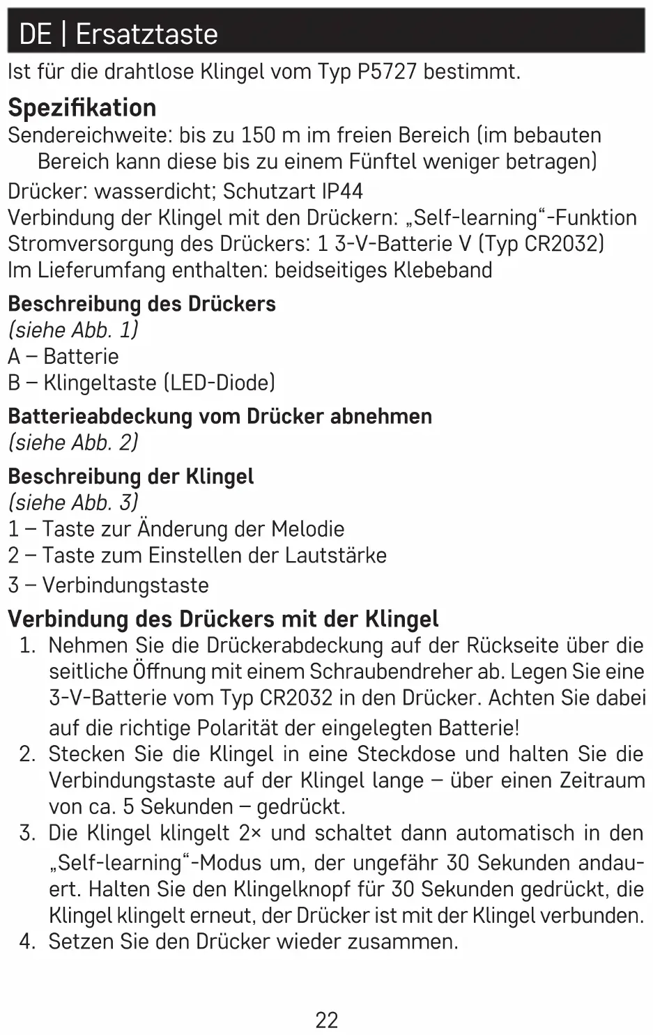 - Wird die Klingel über einen längeren Zeitraum nicht verwendet, nehmen Sie die Batterie aus dem Klingeldrücker.