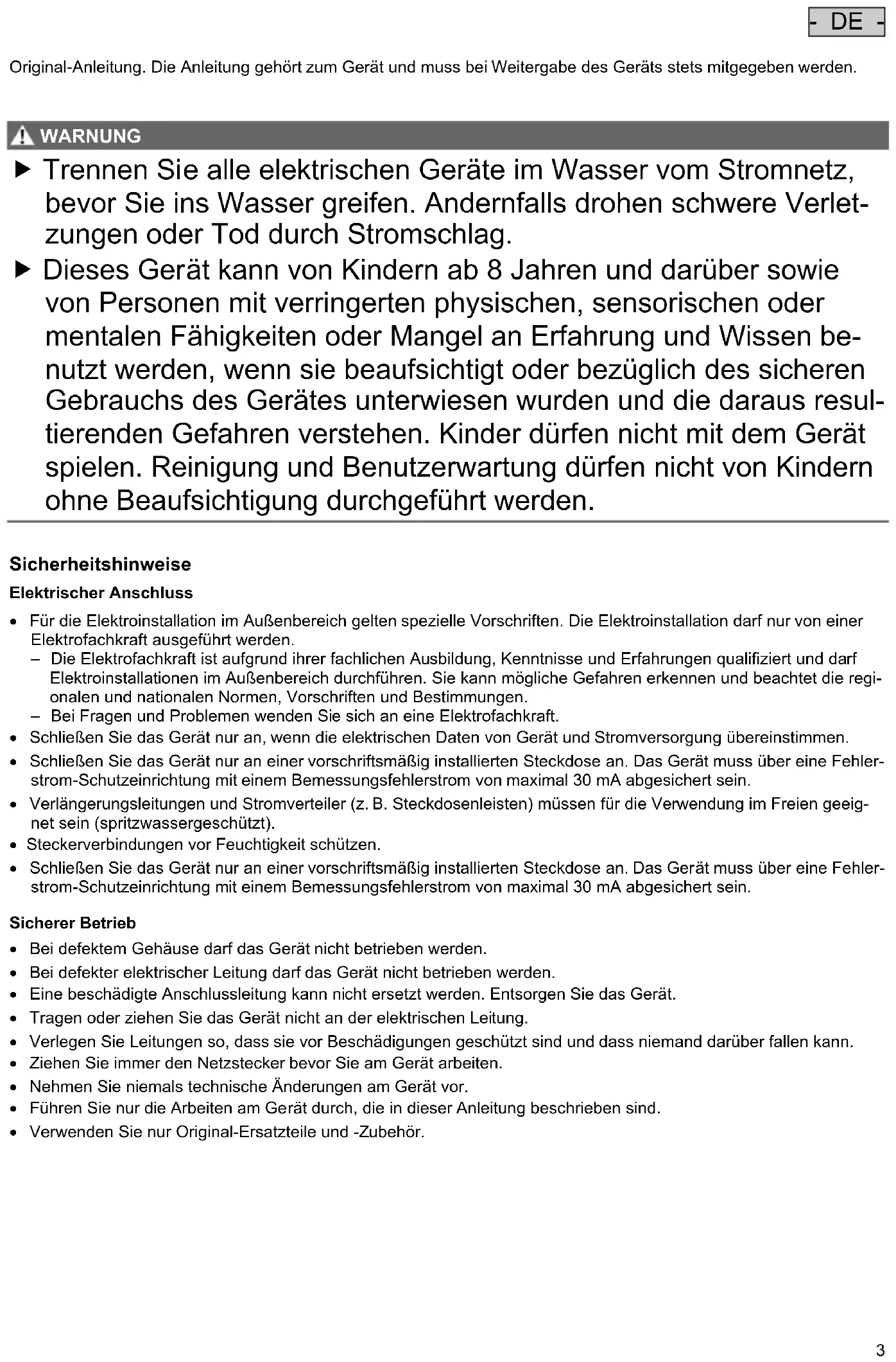 WARNUNG WARNUNG Trennen Sie alle elektrischen Geräte im Wasser vom Stromnetz, bevor Sie ins Wasser greifen. Andernfalls drohen schwere Verlet- zungen oder Tod durch Stromschlag. Dieses Gerät kann von Kindern ab 8 Jahren und darüber sowie von Personen mit verringerten physischen, sensorischen oder mentalen Fähigkeiten oder Mangel an Erfahrung und Wissen be- nutzt werden, wenn sie beaufsichtigt oder bezüglich des sicheren Gebrauchs des Gerätes unterwiesen wurden und die daraus resul- tierenden Gefahren verstehen. Kinder dürfen nicht mit dem Gerät spielen. Reinigung und Benutzerwartung dürfen nicht von Kindern ohne Beaufsichtigung durchgeführt werden.