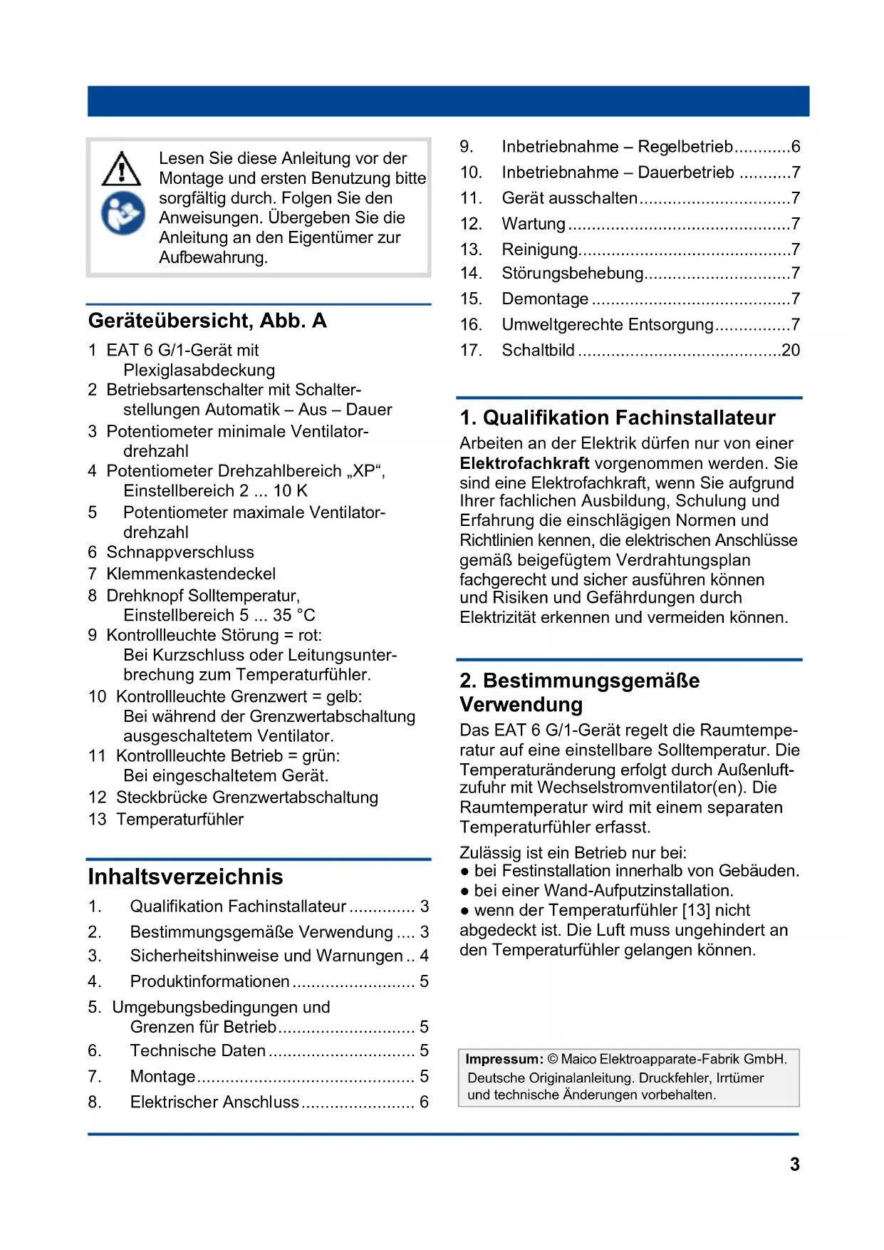 Verwendung Das EAT 6 G/1-Gerät regelt die Raumtempe-ratur auf eine einstellbare Solltemperatur. Die Temperaturänderung erfolgt durch Außenluft-zufuhr mit Wechselstromventilator(en). Die Raumtemperatur wird mit einem separaten Temperaturfühler erfasst. Zulässig ist ein Betrieb nur bei: ● bei Festinstallation innerhalb von Gebäuden. ● bei einer Wand-Aufputzinstallation. ● wenn der Temperaturfühler [13] nicht abgedeckt ist. Die Luft muss ungehindert an den Temperaturfühler gelangen können. Impressum: © Maico Elektroapparate-Fabrik GmbH. Deutsche Originalanleitung. Druckfehler, Irrtümer und technische Änderungen vorbehalten.4