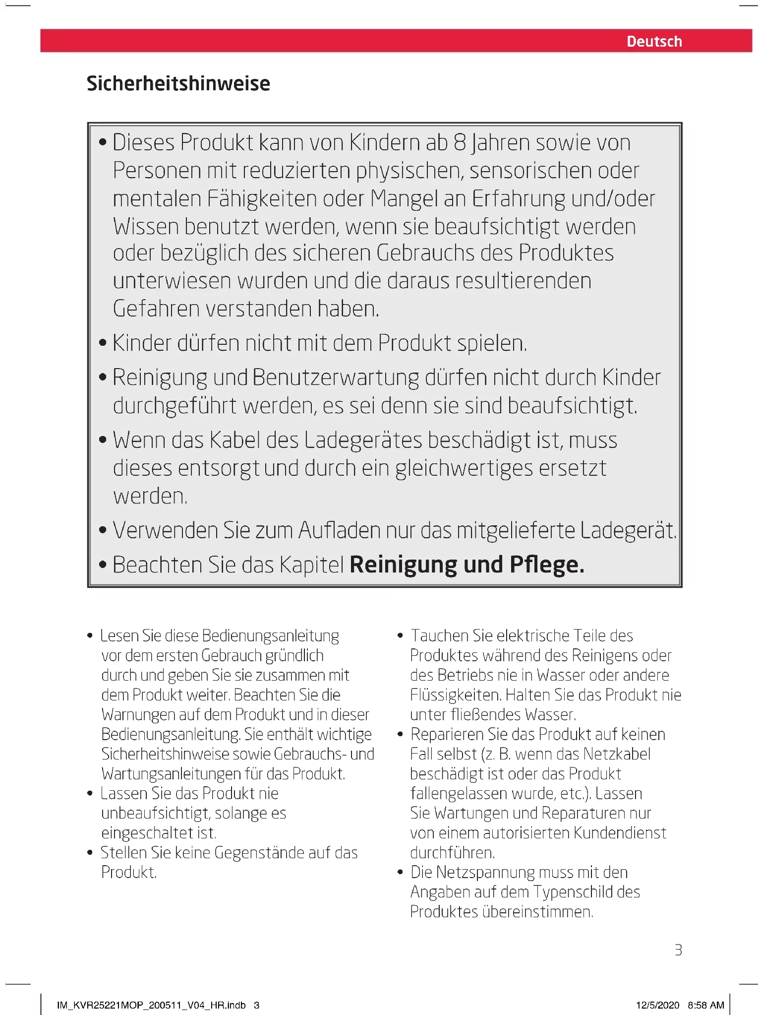 - Tauchen Sie elektrische Teile des Produktes während des Reinigens nie in Wasser oder andere Flüssigkeiten. Halten Sie es nie unter fließendes Wasser. IM_KVR25221MOP_200511_V04_HR.indb 7IM_KVR25221MOP_200511_V04_HR.indb 7 12/5/2020 8:58 AM12/5/2020 8:58 AM8 Deutsch Size - A5 Montieren Sie alle zuvor entnommenen Komponenten. Die Montage erfolgt in umgekehrter Reihenfolge. Hinweis: