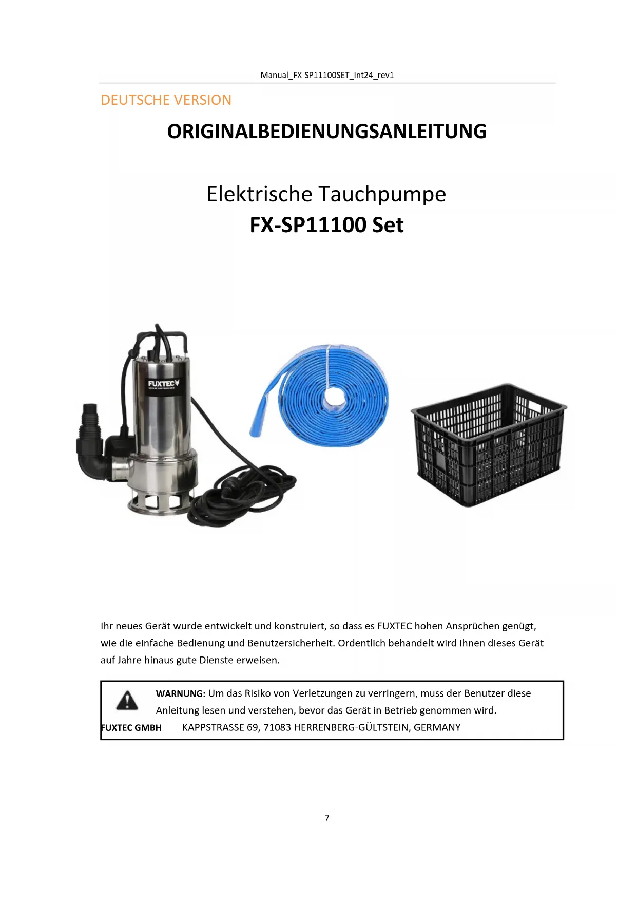 DEUTSCHE VERSION ORIGINALBEDIENUNGSANLEITUNG Elektrische Tauchpumpe FX-SP11100 Set