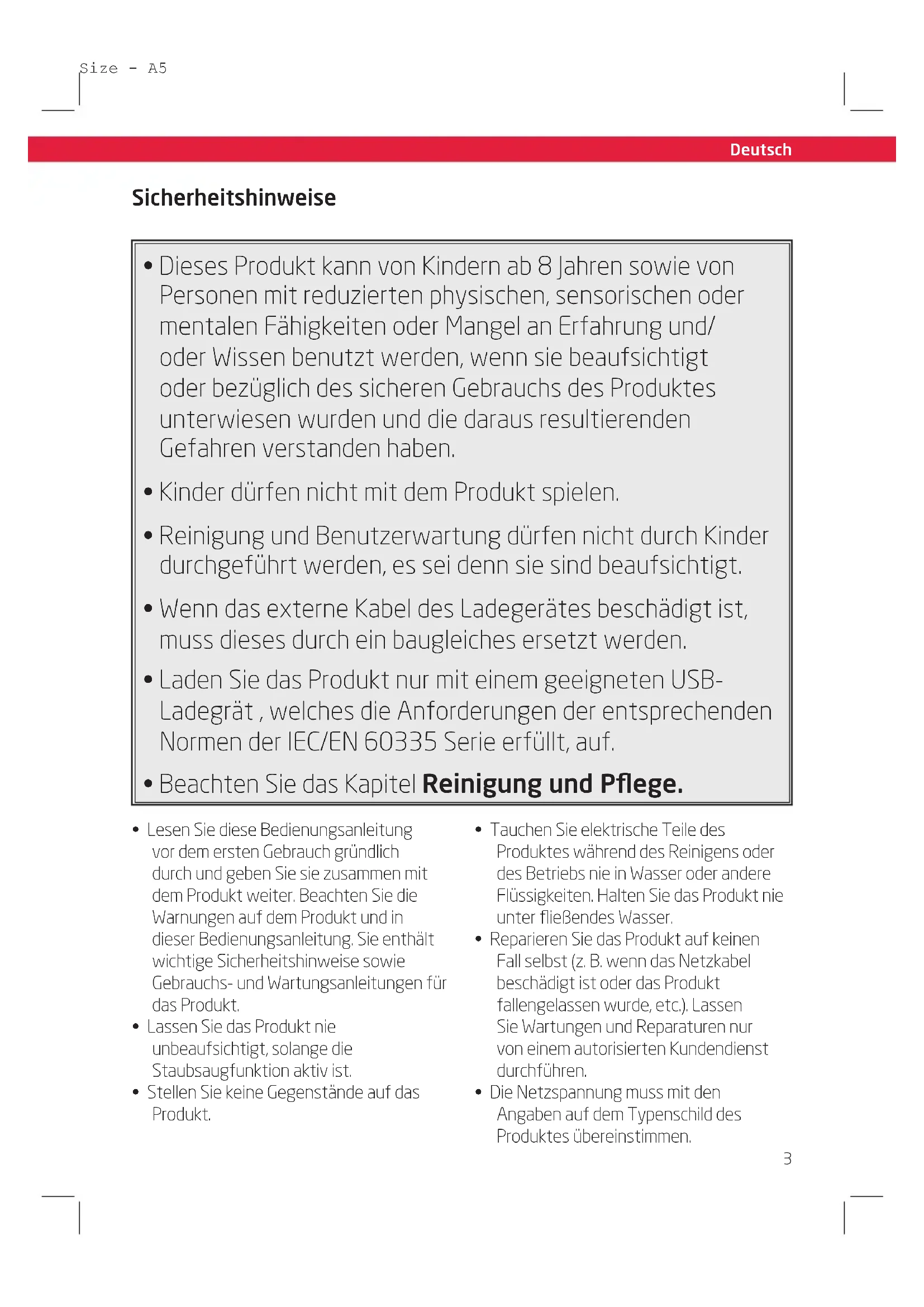 - Die Netzspannung muss mit den Angaben auf dem Typenschild des Produktes übereinstimmen.4 Deutsch Size - A5 Size - A5 Sicherheitshinweise