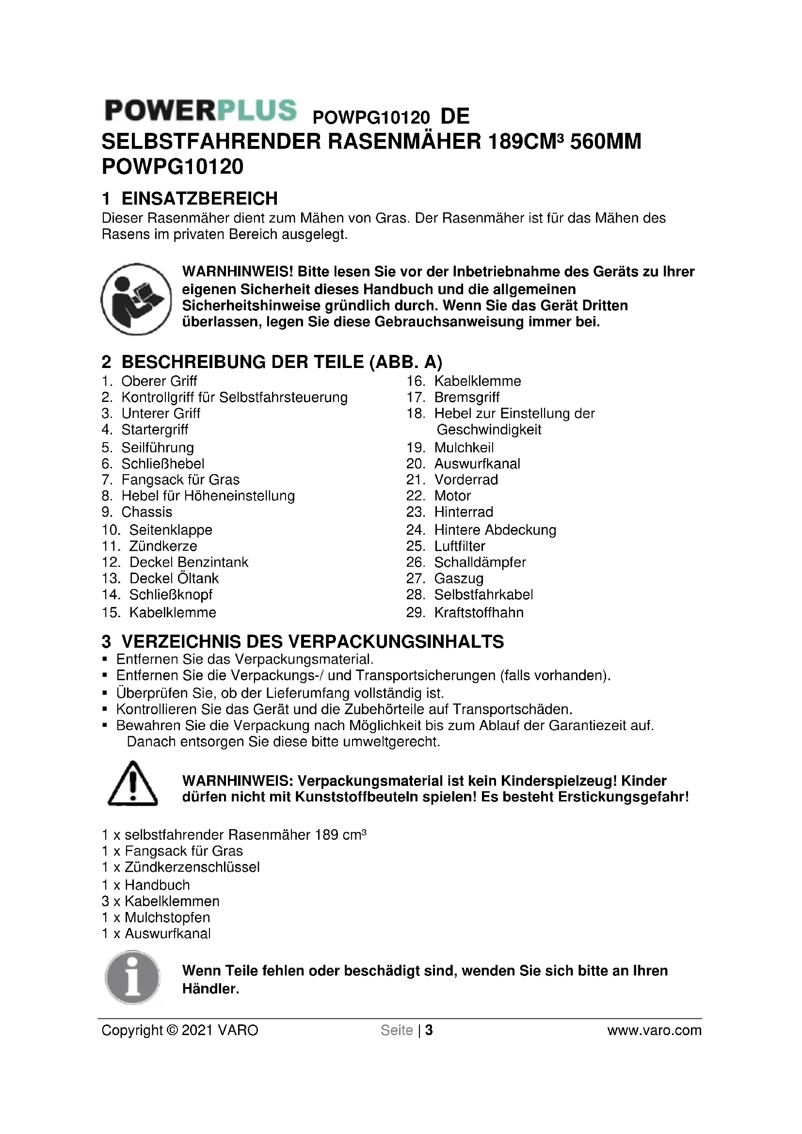 - Bewahren Sie die Verpackung nach Möglichkeit bis zum Ablauf der Garantiezeit auf. Danach entsorgen Sie diese bitte umweltgerecht. WARNHINWEIS: Verpackungsmaterial ist kein Kinderspielzeug! Kinder dürfen nicht mit Kunststoffbeuteln spielen! Es besteht Erstickungsgefahr! 1 x selbstfahrender Rasenmäher 189 cm³ 1 x Fangsack für Gras 1 x Zündkerzenschlüssel 1 x Handbuch 3 x Kabelklemmen 1 x Mulchstopfen 1 x Auswurfkanal Wenn Teile fehlen oder beschädigt sind, wenden Sie sich bitte an Ihren Händler.POWPG10120 DE Copyright © 2021 VARO Seite | 4 www.varo.com