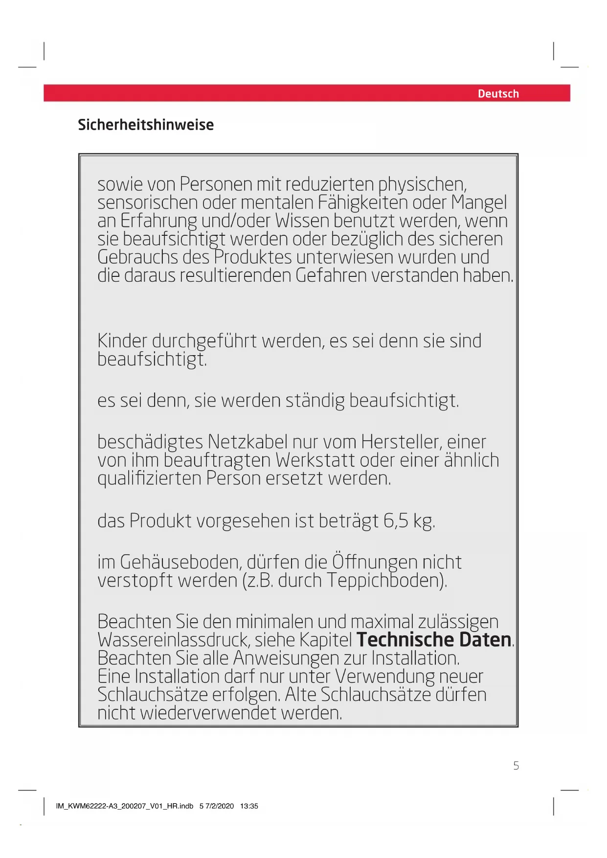 - Das Gerät ist an die Wasserversorgung angeschlossen. Beachten Sie den minimalen und maximal zulässigen Wassereinlassdruck, siehe Kapitel Technische Daten. Beachten Sie alle Anweisungen zur Installation. Eine Installation darf nur unter Verwendung neuer Schlauchsätze erfolgen. Alte Schlauchsätze dürfen nicht wiederverwendet werden. IM_KWM62222-A3_200207_V01_HR.indb 5 7/2/2020 13:35Deutsch