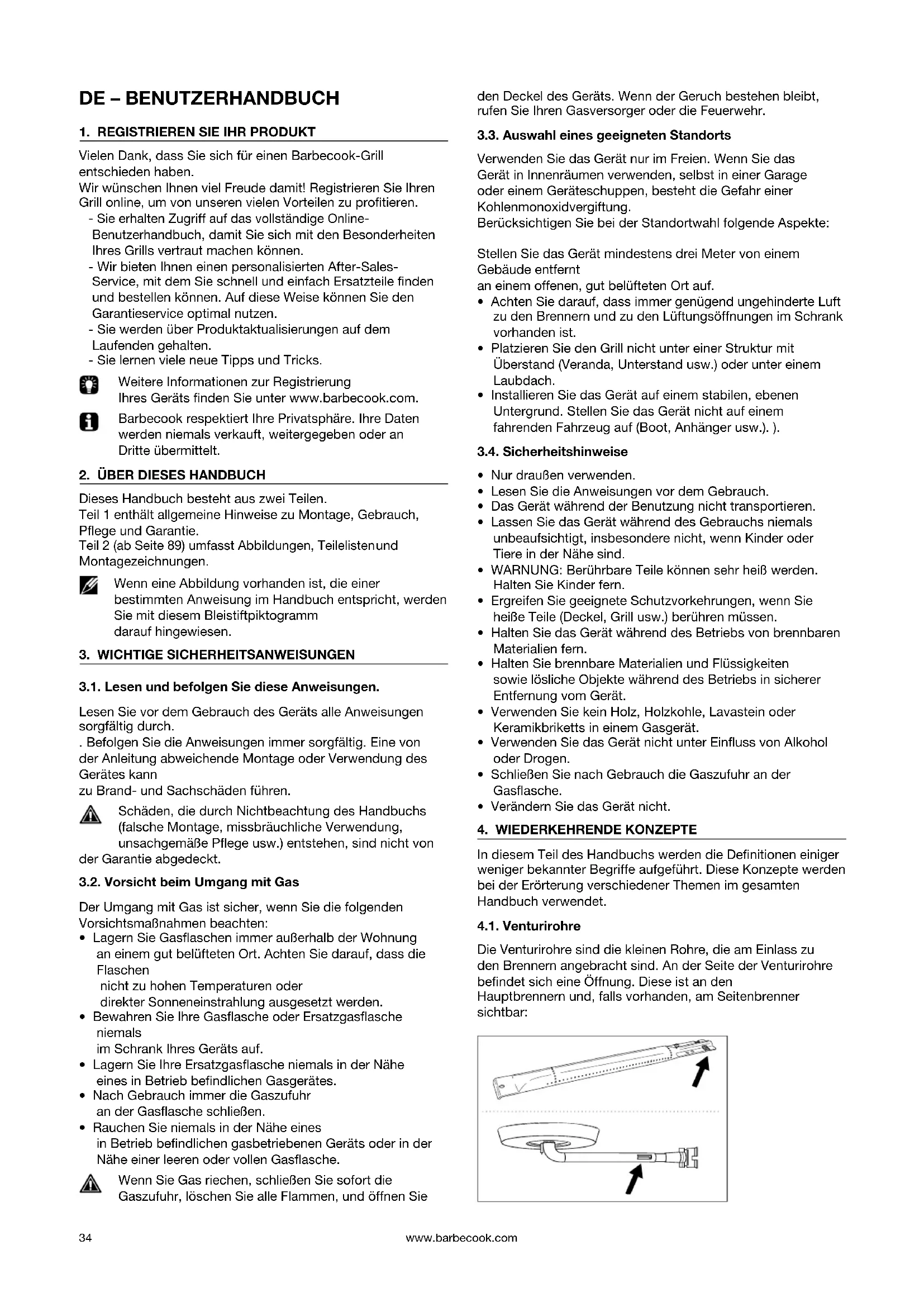 Vielen Dank, dass Sie sich für einen Barbecook-Grill entschieden haben. Wir wünschen Ihnen viel Freude damit! Registrieren Sie Ihren Grill online, um von unseren vielen Vorteilen zu protieren. - Sie erhalten Zugriff auf das vollständige Online- Benutzerhandbuch , damit Sie sich mit den Besonderheiten Ihres Grills vertraut machen können. - Wir bieten Ihnen einen personalisierten After-Sales- Service, mit dem Sie schnell und einfach Ersatzteile nden und bestellen können. Auf diese Weise können Sie den Garantieservice optimal nutzen. - Sie werden über Produktaktualisierungen auf dem Laufenden gehalten. - Sie lernen viele neue Tipps und Tricks. Weitere Informationen zur Registrierung Ihres Geräts nden Sie unter www.barbecook.com. Barbecook respektiert Ihre Privatsphäre. Ihre Daten werden niemals verkauft, weitergegeben oder an Dritte übermittelt.
