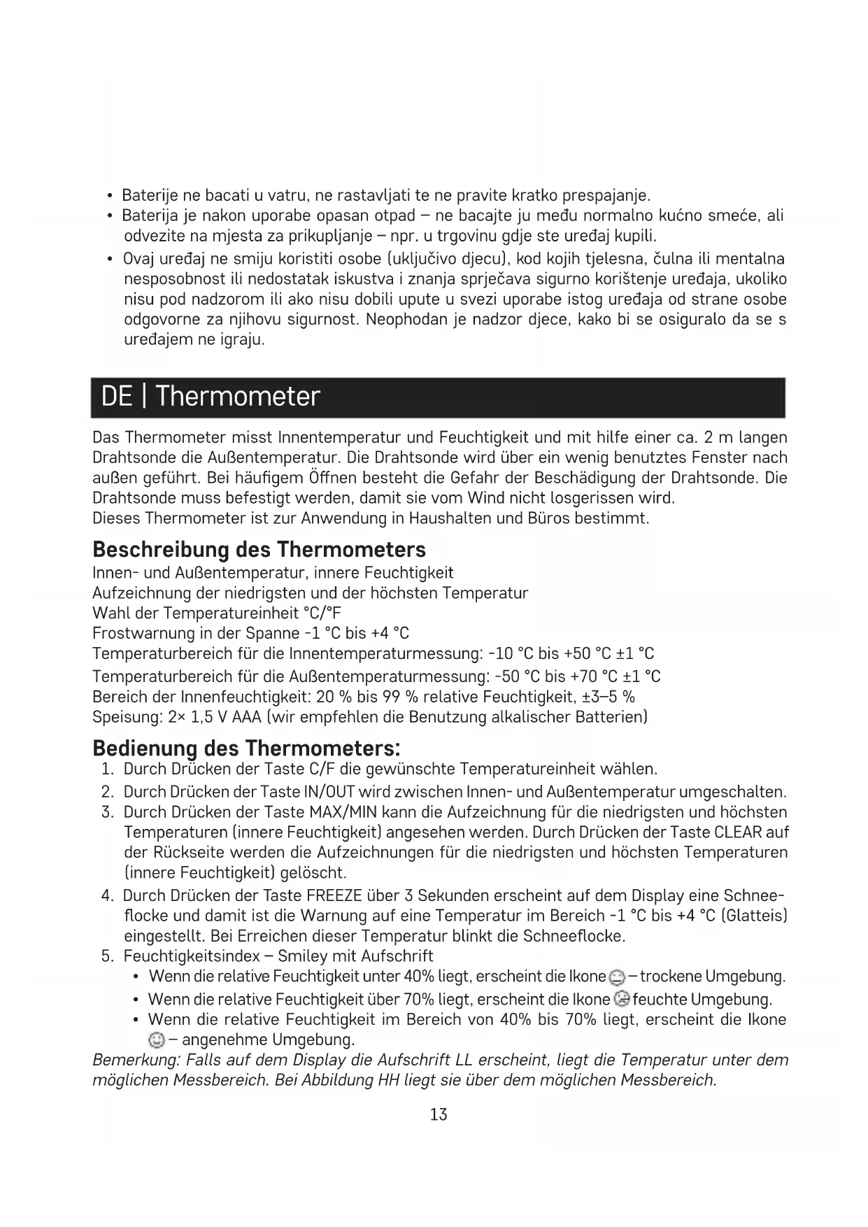 - Ovaj uređaj ne smiju koristiti osobe (uključivo djecu), kod kojih tjelesna, čulna ili mentalna nesposobnost ili nedostatak iskustva i znanja sprječava sigurno korištenje uređaja, ukoliko nisu pod nadzorom ili ako nisu dobili upute u svezi uporabe istog uređaja od strane osobe odgovorne za njihovu sigurnost. Neophodan je nadzor djece, kako bi se osiguralo da se s uređajem ne igraju. DE | Thermometer Das Thermometer misst Innentemperatur und Feuchtigkeit und mit hilfe einer ca. 2 m langen Drahtsonde die Außentemperatur. Die Drahtsonde wird über ein wenig benutztes Fenster nach außen geführt. Bei häugem Önen besteht die Gefahr der Beschädigung der Drahtsonde. Die Drahtsonde muss befestigt werden, damit sie vom Wind nicht losgerissen wird. Dieses Thermometer ist zur Anwendung in Haushalten und Büros bestimmt. Beschreibung des Thermometers Innen- und Außentemperatur, innere Feuchtigkeit Aufzeichnung der niedrigsten und der höchsten Temperatur Wahl der Temperatureinheit °C/°F Frostwarnung in der Spanne -1 °C bis +4 °C Temperaturbereich für die Innentemperaturmessung: -10 °C bis +50 °C ±1 °C Temperaturbereich für die Außentemperaturmessung: -50 °C bis +70 °C ±1 °C Bereich der Innenfeuchtigkeit: 20 % bis 99 % relative Feuchtigkeit, ±3–5 % Speisung: 2×1,5 V AAA (wir empfehlen die Benutzung alkalischer Batterien) Bedienung des Thermometers: