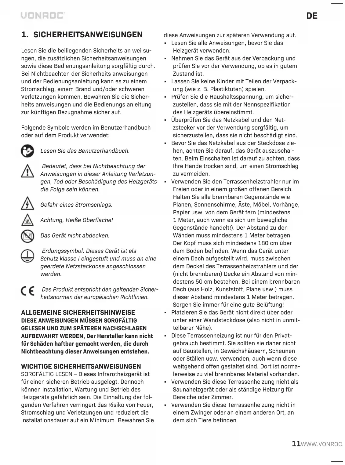 Lesen Sie die beiliegenden Sicherheits an wei su- ngen, die zusätzlichen Sicherheitsanweisungen sowie diese Bedienungsanleitung sorgfältig durch. Bei Nichtbeachten der Sicherheits anweisungen und der Bedienungsanleitung kann es zu einem Stromschlag, einem Brand und/oder schweren Verletzungen kommen. Bewahren Sie die Sicher- heits anweisungen und die Bedienungs anleitung zur künftigen Bezugnahme sicher auf. Folgende Symbole werden im Benutzerhandbuch oder auf dem Produkt verwendet: Lesen Sie das Benutzerhandbuch. Bedeutet, dass bei Nichtbeachtung der Anweisungen in dieser Anleitung Verletzun- gen, Tod oder Beschädigung des Heizgeräts die Folge sein können. Gefahr eines Stromschlags. Achtung, Heiße Oberfläche! Das Gerät nicht abdecken. Erdungssymbol. Dieses Gerät ist als Schutz klasse I eingestuft und muss an eine geerdete Netzsteckdose angeschlossen werden. Das Produkt entspricht den geltenden Sicher- heitsnormen der europäischen Richtlinien. ALLGEMEINE SICHERHEITSHINWEISE