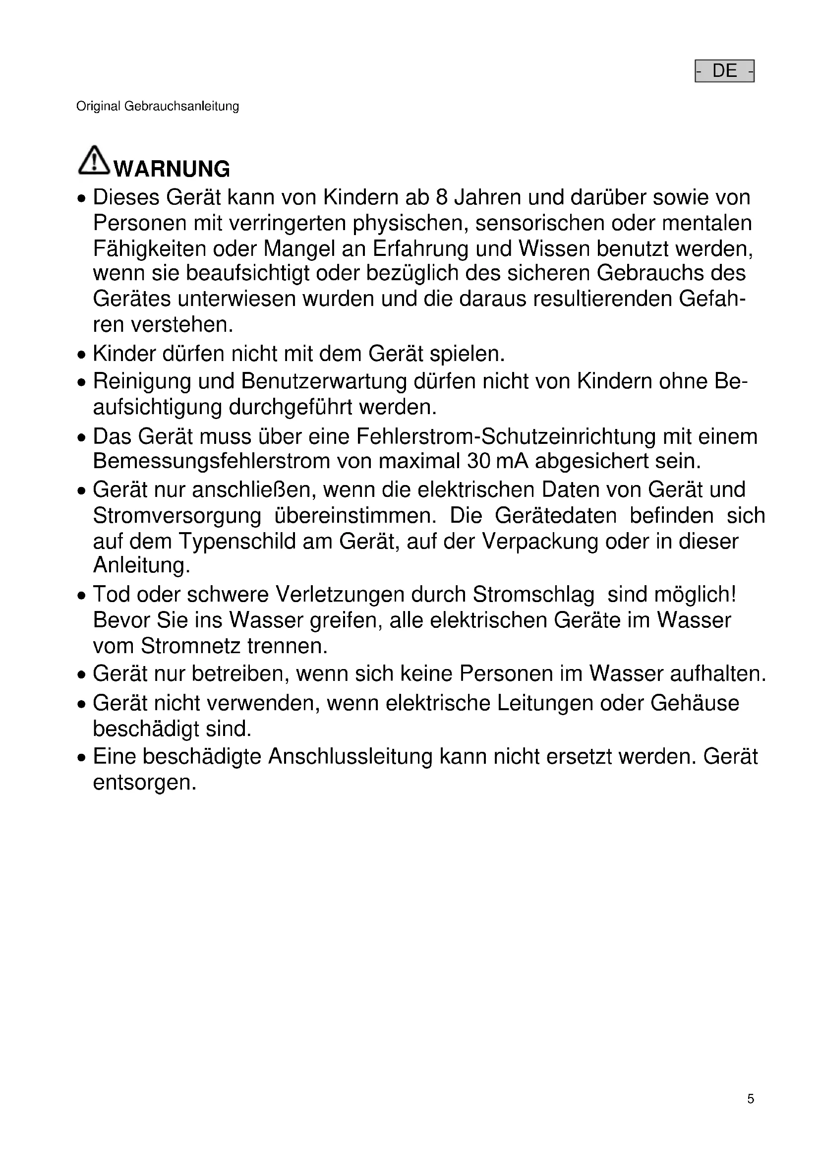 WARNUNG WARNUNG Dieses Gerät kann von Kindern ab 8 Jahren und darüber sowie von Personen mit verringerten physischen, sensorischen oder mentalen Fähigkeiten oder Mangel an Erfahrung und Wissen benutzt werden, wenn sie beaufsichtigt oder bezüglich des sicheren Gebrauchs des Gerätes unterwiesen wurden und die daraus resultierenden Gefah- ren verstehen. Kinder dürfen nicht mit dem Gerät spielen. Reinigung und Benutzerwartung dürfen nicht von Kindern ohne Be- aufsichtigung durchgeführt werden. Das Gerät muss über eine Fehlerstrom-Schutzeinrichtung mit einem Bemessungsfehlerstrom von maximal 30 mA abgesichert sein. Gerät nur anschließen, wenn die elektrischen Daten von Gerät und Stromversorgung übereinstimmen. Die Gerätedaten befinden sich auf dem Typenschild am Gerät, auf der Verpackung oder in dieser Anleitung. Tod oder schwere Verletzungen durch Stromschlag sind möglich! Bevor Sie ins Wasser greifen, alle elektrischen Geräte im Wasser vom Stromnetz trennen. Gerät nur betreiben, wenn sich keine Personen im Wasser aufhalten. Gerät nicht verwenden, wenn elektrische Leitungen oder Gehäuse beschädigt sind. Eine beschädigte Anschlussleitung kann nicht ersetzt werden. Gerät entsorgen.- DE -
