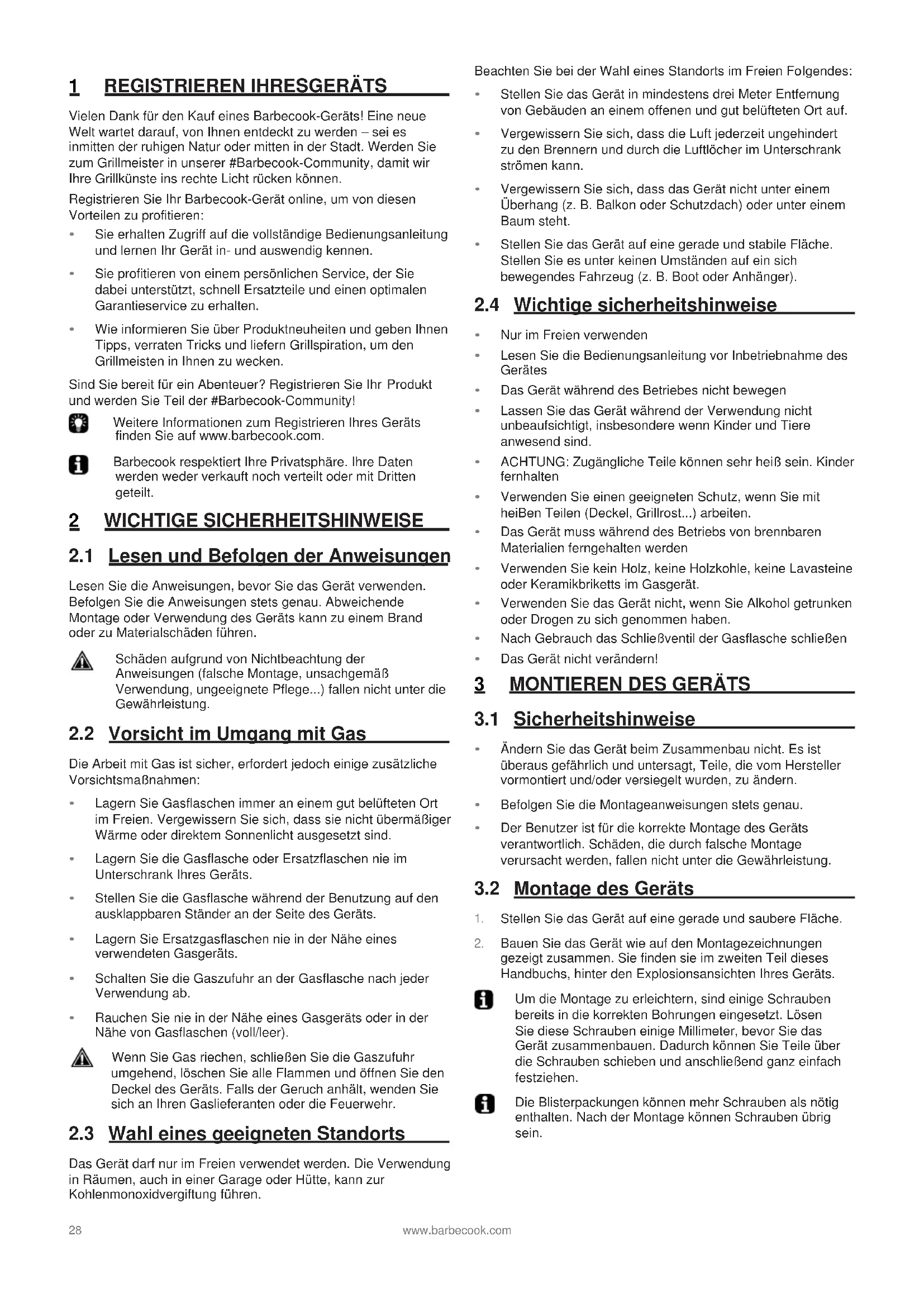 Bauen Sie das Gerät wie auf den Montagezeichnungen gezeigt zusammen. Sie finden sie im zweiten Teil dieses Handbuchs, hinter den Explosionsansichten Ihres Geräts. Um die Montage zu erleichtern, sind einige Schrauben bereits in die korrekten Bohrungen eingesetzt. Lösen Sie diese Schrauben einige Millimeter, bevor Sie das Gerät zusammenbauen. Dadurch können Sie Teile über die Schrauben schieben und anschließend ganz einfach festziehen. Die Blisterpackungen können mehr Schrauben als nötig enthalten. Nach der Montage können Schrauben übrig sein.www.barbecook.com