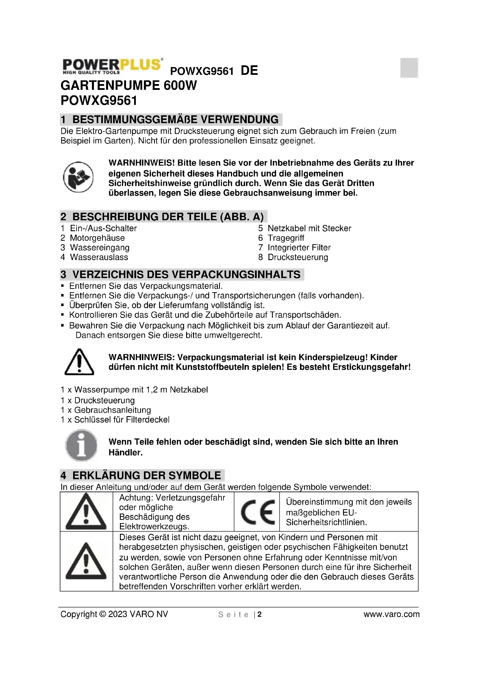 Copyright © 2023 VARO NV S e i t e | 2 www.varo.com GARTENPUMPE 600W POWXG9561 1 BESTIMMUNGSGEMÄßE VERWENDUNG Die Elektro-Gartenpumpe mit Drucksteuerung eignet sich zum Gebrauch im Freien (zum Beispiel im Garten). Nicht für den professionellen Einsatz geeignet. WARNHINWEIS! Bitte lesen Sie vor der Inbetriebnahme des Geräts zu Ihrer eigenen Sicherheit dieses Handbuch und die allgemeinen Sicherheitshinweise gründlich durch. Wenn Sie das Gerät Dritten überlassen, legen Sie diese Gebrauchsanweisung immer bei. 2 BESCHREIBUNG DER TEILE (ABB. A) 1 Ein-/Aus-Schalter 2 Motorgehäuse 3 Wassereingang 4 Wasserauslass 5 Netzkabel mit Stecker 6 Tragegriff 7 Integrierter Filter 8 Drucksteuerung