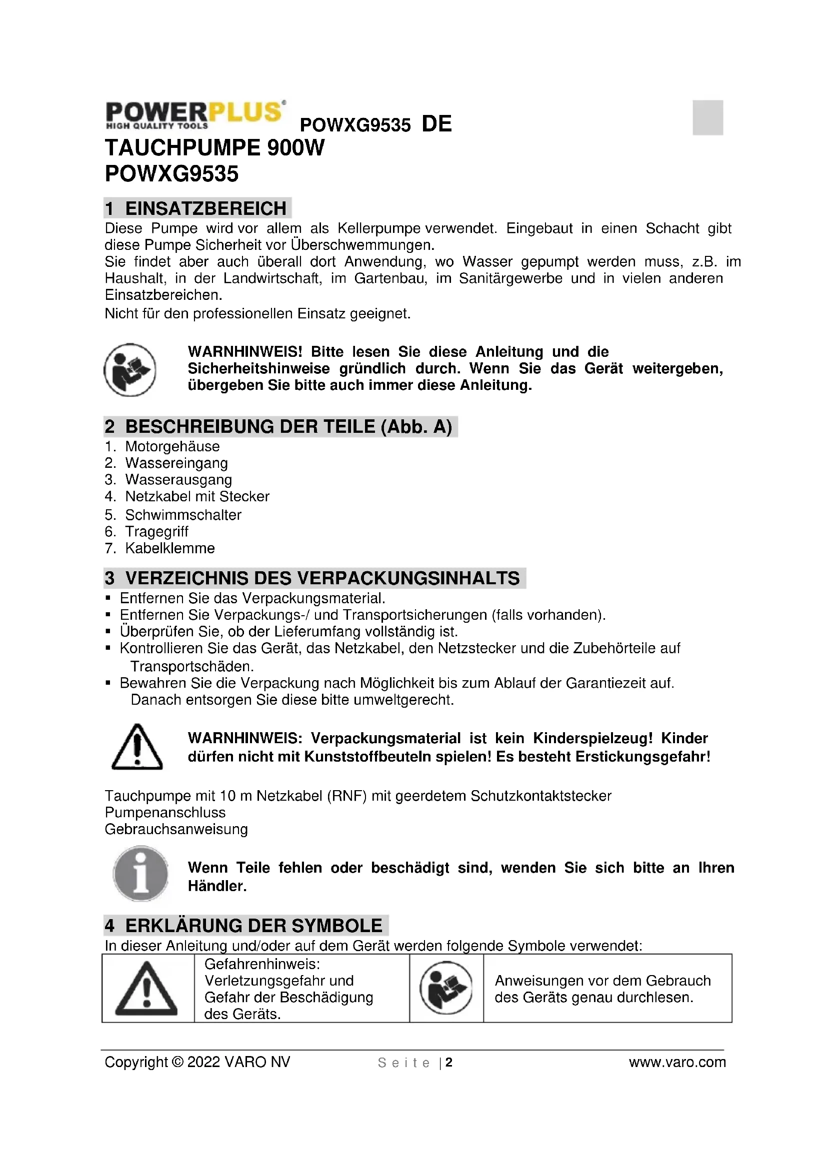 Copyright © 2022 VARO NV S e i t e | 2 www.varo.com TAUCHPUMPE 900W POWXG9535 1 EINSATZBEREICH Diese Pumpe wird vor allem als Kellerpumpe verwendet. Eingebaut in einen Schacht gibt diese Pumpe Sicherheit vor Überschwemmungen. Sie findet aber auch überall dort Anwendung, wo Wasser gepumpt werden muss, z.B. im Haushalt, in der Landwirtschaft, im Gartenbau, im Sanitärgewerbe und in vielen anderen Einsatzbereichen. Nicht für den professionellen Einsatz geeignet. WARNHINWEIS! Bitte lesen Sie diese Anleitung und die Sicherheitshinweise gründlich durch. Wenn Sie das Gerät weitergeben, übergeben Sie bitte auch immer diese Anleitung. 2 BESCHREIBUNG DER TEILE (Abb. A)