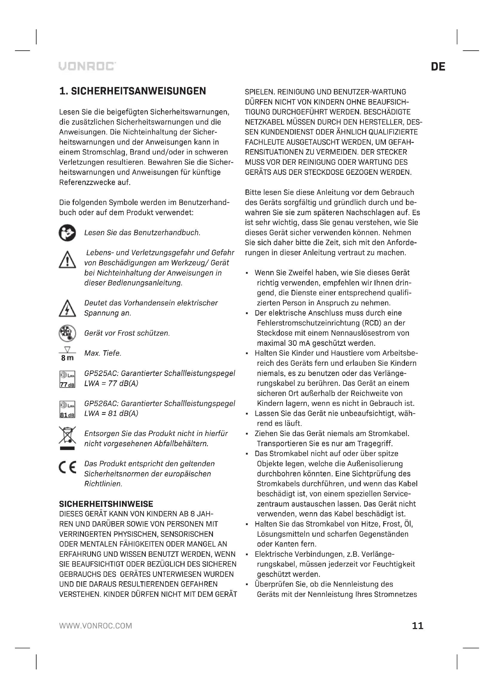 Finden Sie kostenlos die Bedienungsanleitung des Geräts GP525AC Vonroc als PDF.