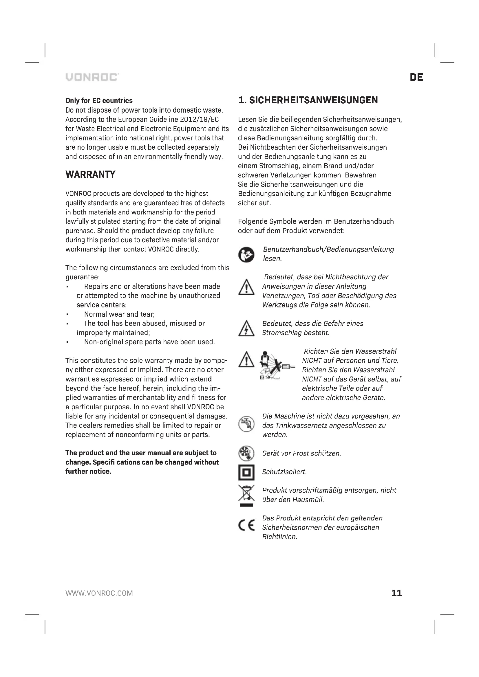 - Es wurden keine Original-Ersatzteile verwendet. Dies stellt die einzige Gewährleistung des Unterneh- mens dar, sowohl ausdrücklich als auch implizit. Es gibt keine anderen ausdrücklichen oder stillsch- weigenden Garantien, die über das hier Genannte hinausgehen, einschließlich der stillschweigenden Garantien der Marktgängigkeit oder Eignung für ei- nen bestimmten Zweck. In keinem Fall ist VONROC haftbar für Neben- oder Folgeschäden. Die Rechts- mittel des Händlers beschränken sich auf Reparatur oder Ersatz fehlerhafter Einheiten oder Teile. Am Produkt und am Benutzerhandbuch können Än- derungen vorgenommen werden. Die technischen Daten können sich ohne Vorankündigung ändern.NL