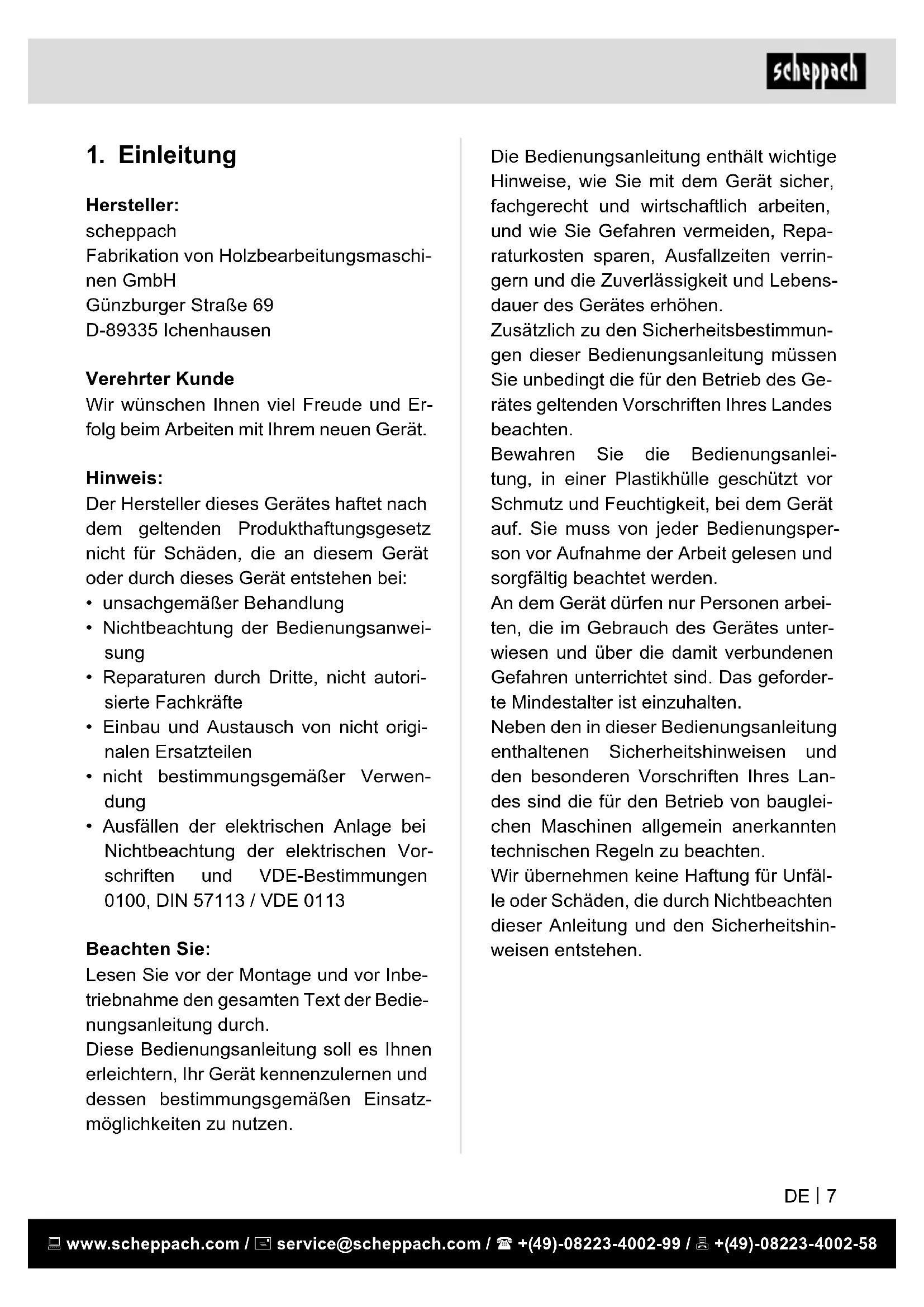 Hersteller: scheppach Fabrikation von Holzbearbeitungsmaschi- nen GmbH Günzburger Straße 69 D-89335 Ichenhausen Verehrter Kunde Wir wünschen Ihnen viel Freude und Er- folg beim Arbeiten mit Ihrem neuen Gerät. Hinweis: Der Hersteller dieses Gerätes haftet nach dem geltenden Produkthaftungsgesetz nicht für Schäden, die an diesem Gerät oder durch dieses Gerät entstehen bei: