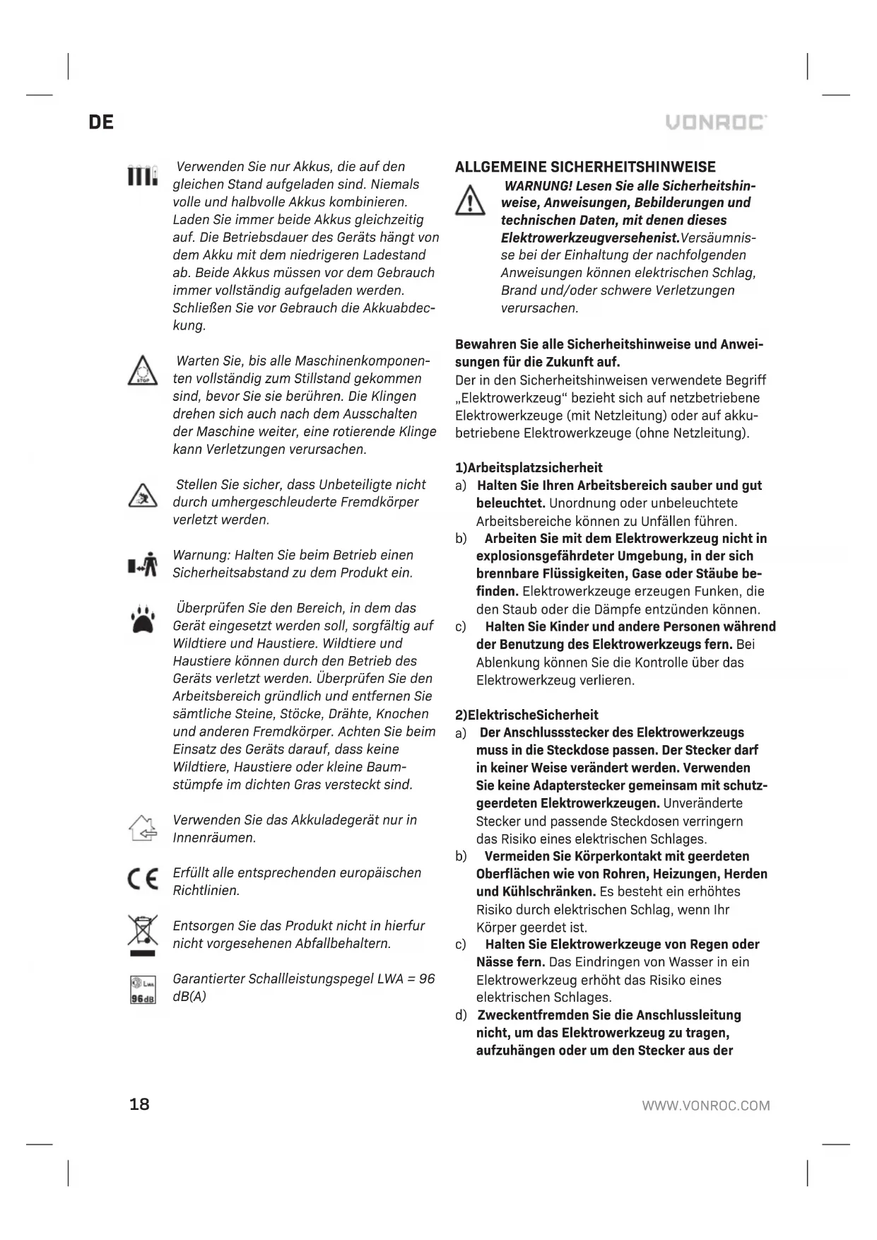 Verwenden Sie nur Akkus, die auf den gleichen Stand aufgeladen sind. Niemals volle und halbvolle Akkus kombinieren. Laden Sie immer beide Akkus gleichzeitig auf. Die Betriebsdauer des Geräts hängt von dem Akku mit dem niedrigeren Ladestand ab. Beide Akkus müssen vor dem Gebrauch immer vollständig aufgeladen werden. Schließen Sie vor Gebrauch die Akkuabdec- kung. Warten Sie, bis alle Maschinenkomponen- ten vollständig zum Stillstand gekommen sind, bevor Sie sie berühren. Die Klingen drehen sich auch nach dem Ausschalten der Maschine weiter, eine rotierende Klinge kann Verletzungen verursachen. Stellen Sie sicher, dass Unbeteiligte nicht durch umhergeschleuderte Fremdkörper verletzt werden. Warnung: Halten Sie beim Betrieb einen Sicherheitsabstand zu dem Produkt ein. Überprüfen Sie den Bereich, in dem das Gerät eingesetzt werden soll, sorgfältig auf Wildtiere und Haustiere. Wildtiere und Haustiere können durch den Betrieb des Geräts verletzt werden. Überprüfen Sie den Arbeitsbereich gründlich und entfernen Sie sämtliche Steine, Stöcke, Drähte, Knochen und anderen Fremdkörper. Achten Sie beim Einsatz des Geräts darauf, dass keine Wildtiere, Haustiere oder kleine Baum- stümpfe im dichten Gras versteckt sind. Verwenden Sie das Akkuladegerät nur in Innenräumen. Erfüllt alle entsprechenden europäischen Richtlinien. Entsorgen Sie das Produkt nicht in hierfur nicht vorgesehenen Abfallbehaltern. Garantierter Schallleistungspegel LWA = 96 dB(A) ALLGEMEINE SICHERHEITSHINWEISE WARNUNG! Lesen Sie alle Sicherheitshin- weise, Anweisungen, Bebilderungen und technischen Daten, mit denen dieses Elektro werk zeug versehen ist. Versäumnis- se bei der Einhaltung der nachfolgenden Anweisungen können elektrischen Schlag, Brand und/oder schwere Verletzungen verursachen. Bewahren Sie alle Sicherheitshinweise und Anwei- sungen für die Zukunft auf. Der in den Sicherheitshinweisen verwendete Begriff „Elektrowerkzeug“ bezieht sich auf netzbetriebene Elektrowerkzeuge (mit Netzleitung) oder auf akku- betriebene Elektrowerkzeuge (ohne Netzleitung).